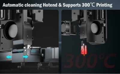 - All-Metal Hotend: Unterstützt Temperaturen bis zu 300°C und ist mit einer selbstreinigenden Düse ausgestattet.