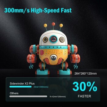 Der neue Artillery Sidewinder X3 Plus ist ein fortschrittlicher 3D-Drucker, der für sein großes Bauvolumen und seine beeindruckende Druckgeschwindigkeit bekannt ist. Mit einem Bauvolumen von 300 x 300 x 400 mm bietet er genügend Raum für größere Druckprojekte. Die maximale Druckgeschwindigkeit von 300 mm/s ermöglicht eine effiziente Fertigung von Modellen.