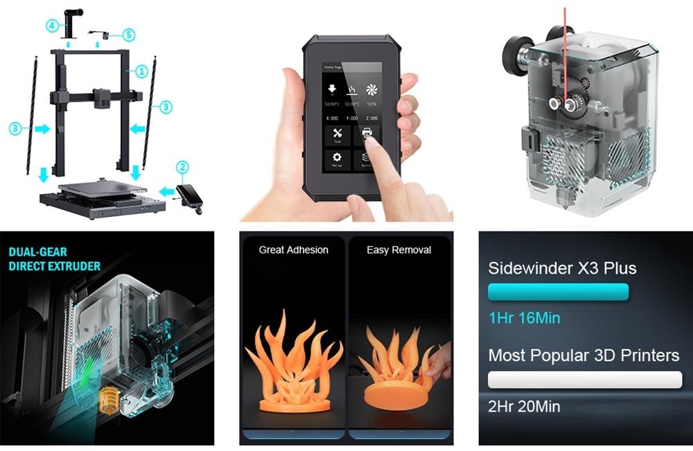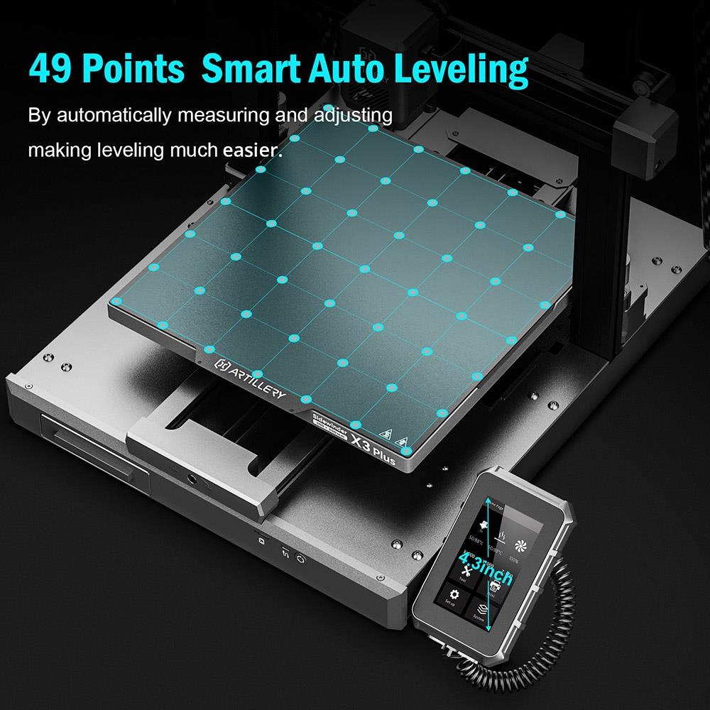 Zu den intelligenten Funktionen des Sidewinder X3 Plus zählt eine magnetische PEI-Bauplattform, die nicht nur eine hervorragende Haftung während des Druckvorgangs bietet, sondern auch das Entfernen der fertigen Objekte vereinfacht. Die automatische 49 Punkte-Nivellierung trägt dazu bei, den Druckprozess zu optimieren und die Bedienung zu vereinfachen. Das integrierte LED-Licht sorgt für eine gute Sichtbarkeit des Druckbereichs, während der 4,3 Zoll Touchscreen eine intuitive Steuerung des Druckers ermöglicht.