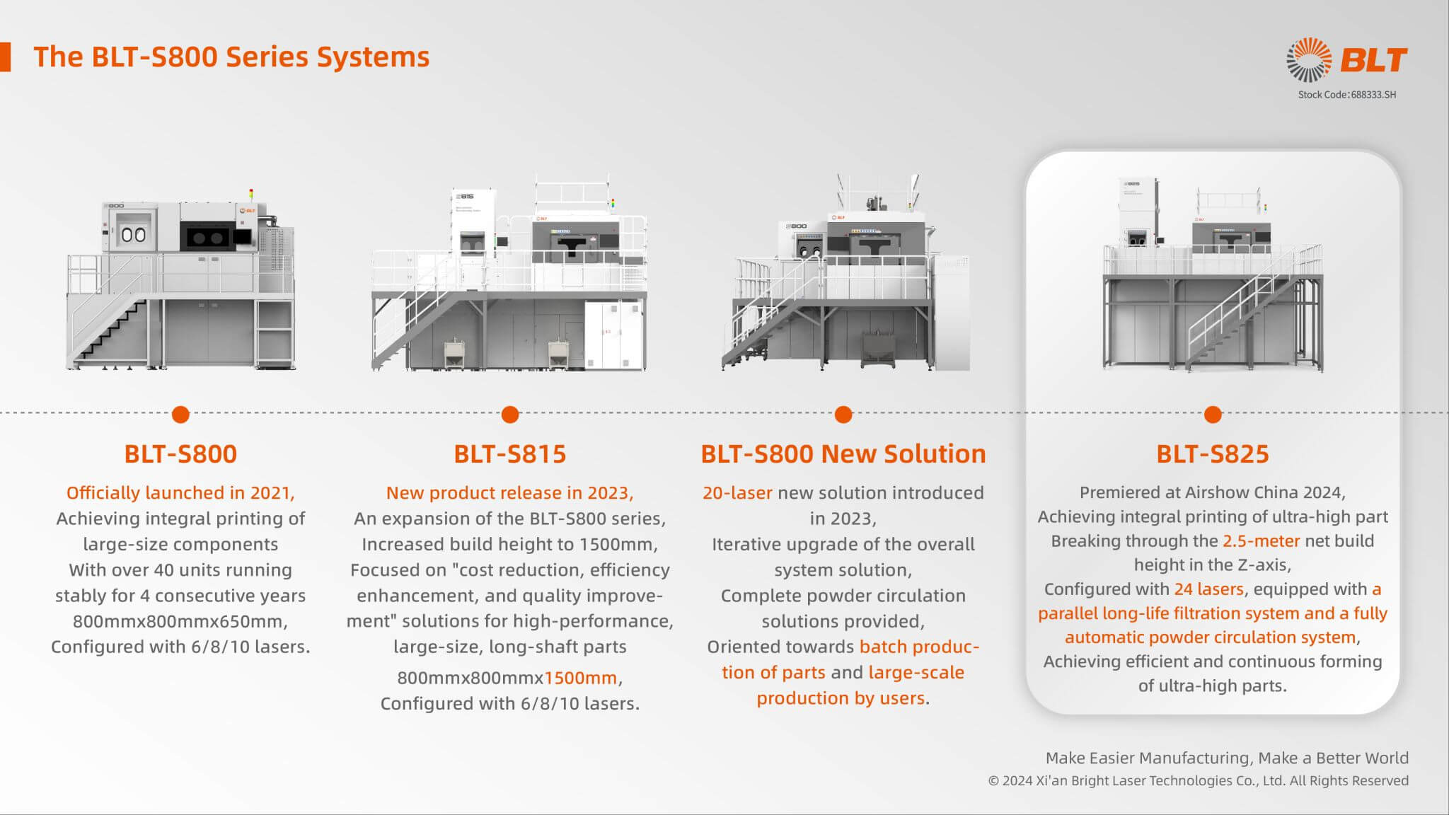 BLT hat in den vergangenen Jahren umfangreiche Erfahrungen mit großformatigen 3D-Druckern gesammelt und das BLT-S825 auf Basis bewährter Technologien weiterentwickelt. Mit einer externen Höhe von lediglich 5,5 Metern passt das System in standardisierte Werkstätten und ist insbesondere für die Luft– und Raumfahrtindustrie geeignet.