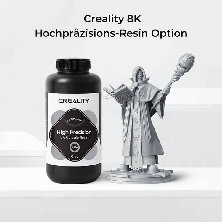 Die orangefarbene Tönung des Klappdeckels blockiert 99,89 % des UV-Lichts der Umgebung. An der Z-Achse, die von einem leistungsstarken Motor auf und ab bewegt wird, befinden sich zwei starre Linearschienen. Das reduziert das Taumeln erheblich und ist für größere und schwerere Drucke ideal. Bei dem Harz für den 3D-Drucker HALOT-MAGE verspricht Creality hohe Qualität mit geringer Schrumpfung und Viskosität. Die mit Wasser auswaschbare Formel erzeugt weniger Geruch oder Hautreizungen. Das Harz ist in leuchtenden Farben verfügbar. Creality empfiehlt für bessere Druckergebnisse den 3D-Druck mit Creality 8K Hochpräzisionsharz.