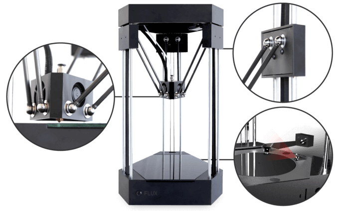 Der Flux 3D-Drucker hat ein schlichtes Design, wo der Fokus auf der Funktion liegt und eine sehr kompakte Bauweise aufweist. Vom Auspacken bis zum ersten 3D-Ausdruck erfordert es nach Angaben der Entwickler nur wenige Minuten. Bei einer notwendigen Reparatur muss nur das betreffende Bauteil entfernt werden. Nach der Reparatur wird es einfach wieder montiert.
