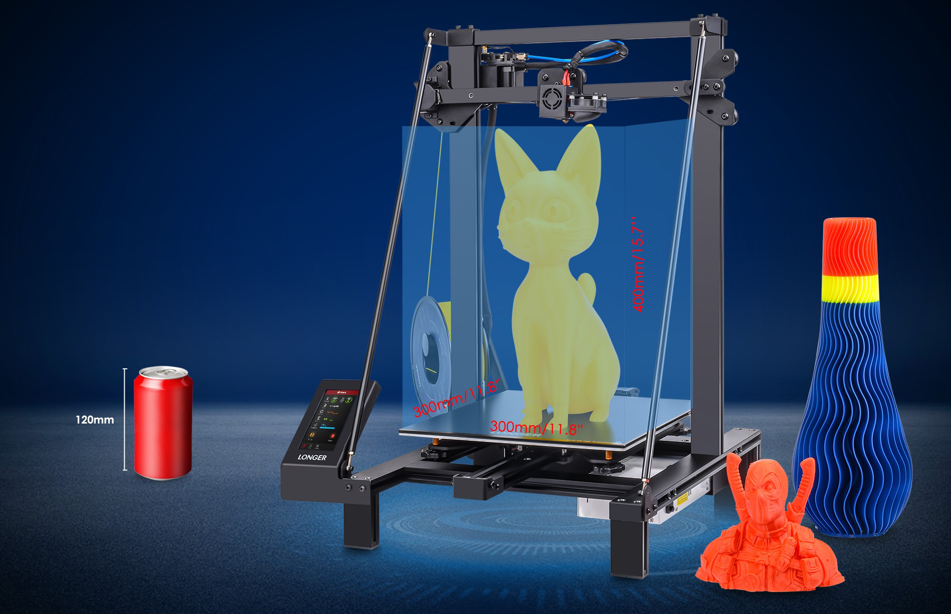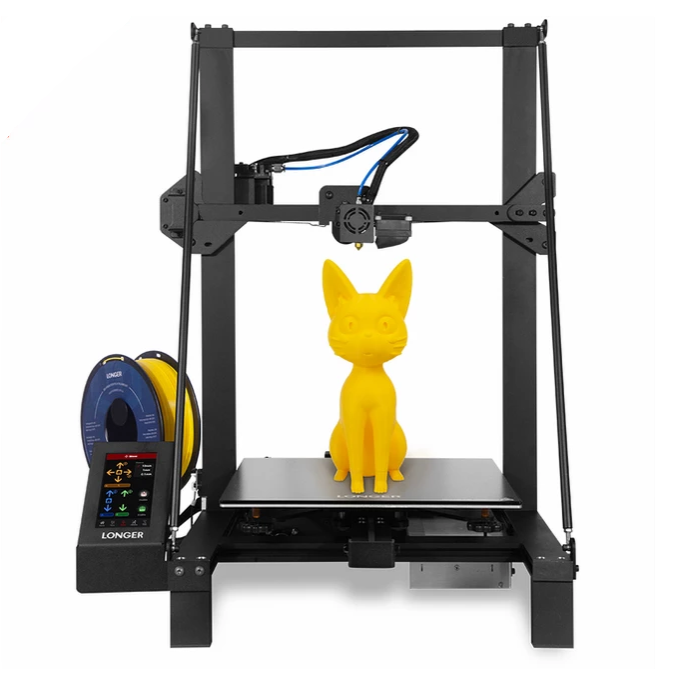 Der Longer LK5 Pro ist klassisch schwarz und bietet durch seine spezielle Dreiecksstruktur mehr Stabilität ohne Schütteln. So wird außerdem weniger Platz am Einsatzort benötigt. Er hat ein Bauvolumen von 300 x 300 x 400 mm. Der Druckvorgang kann über das 4,3 Zoll Vollfarb-Touch-Display intuitiv gesteuert werden.