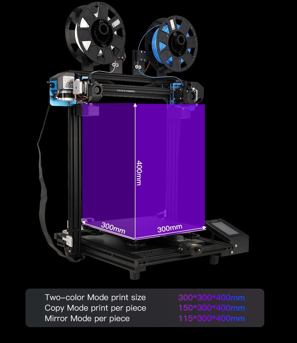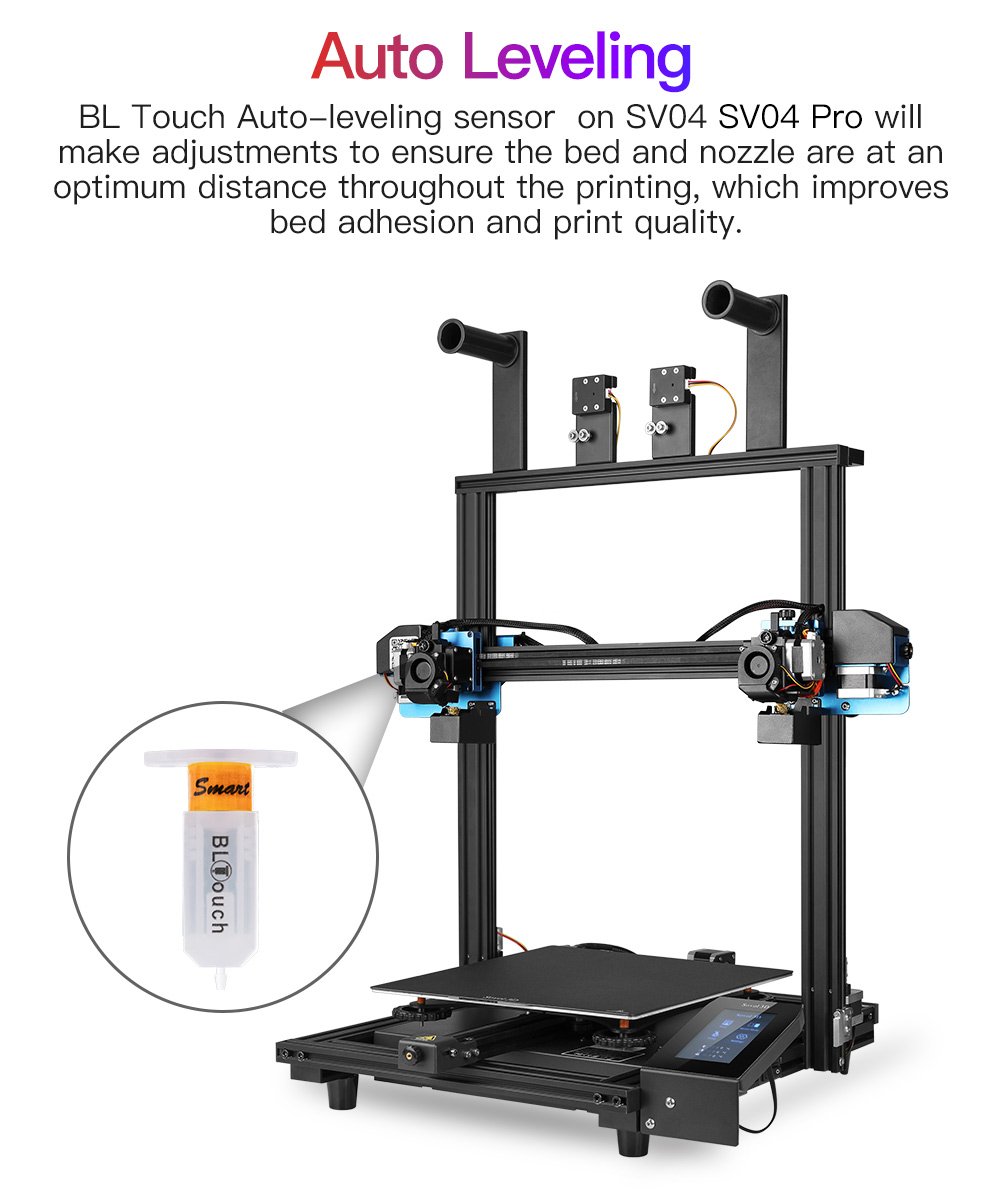 Der 3D-Drucker ist mit einem 300 x 300 x 400 mm großen Bauvolumen ausgestattet und hat ein IDEX-System. Zwei Z-Achsen-Schrauben und Schrittmotoren ermöglichen genauere und präzisere vertikale Bewegung der Düse bei einer Z-Achsen-Genauigkeit von 0,001 mm. Einstellbare Gurtspanner sorgen für stabilen Halt. Die Druckplatte lässt sich verbiegen, wodurch das 3D-gedruckte Objekt einfach abgenommen werden kann, ohne weitere Hilfsmittel. Das 4,3-Zoll-Touch-Display ermöglicht einfaches Steuern durch den Druckvorgang. Der SV04 Pro IDEX kann verschiedene Materialien wie PLA, ASA, PVA, PETG, TPU, Wood, PC, ABS und andere verarbeiten.