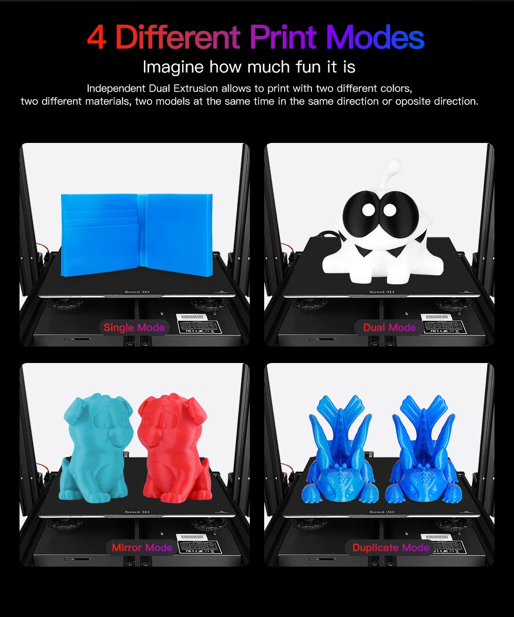 Der 3D-Drucker SV04 Pro IDEX kann dank seines Independent Dual Extruders 3D-Drucke in vier verschiedenen Modi (Single, Dual, Duplicate, Mirror) herstellen. Dabei druckt er wahlweise mit unterschiedlichen Farben oder auch unterschiedlichen Materialien. Zwei Filamentsensoren informieren darüber, wenn das Filament langsam zur Neige geht, und verhindern unerwünschte Druckabbrüche. Eine Wiederaufnahmefunktion ermöglicht zudem, dass der Druck an einer jeder Stelle angehalten und fehlerfrei zu einem späteren Zeitpunkt fortgesetzt werden kann.