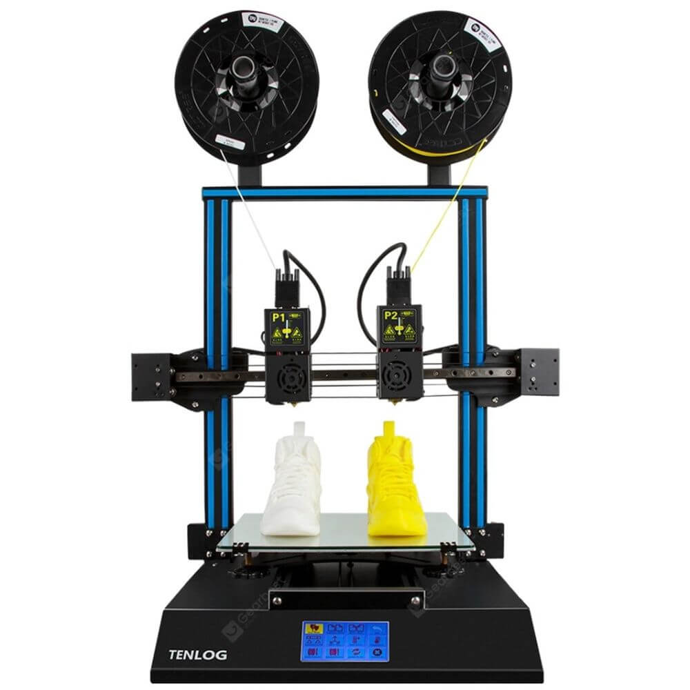 Der Tenlog TL-D3 Pro 3D-Drucker wird wie bereits erwähnt als Bausatz geliefert, ist aber zu einem Großteil vormontiert. Er nutzt die FDM/FFF-3D-Druck-Technologie. Der Tenlog TL-D3 ist im Gegensatz zu den meisten anderen Low-Cost-3D-Druckern mit zwei Düsen ausgestattet und unterstützt so mehrere Druckmodi. So ist es beispielsweise möglich, ein Objekt in zwei verschiedenen Farben und vom Grundsatz her auch mit unterschiedlichen Materialien zu drucken, ohne dass das Filament gewechselt werden muss. Am Besten eignen sich dafür PVA, PLA und TPU Filamente. Zusätzlich zu diesen akzeptiert er auch ABS, HIPS, PETG, WOOD und flexible Filamente.