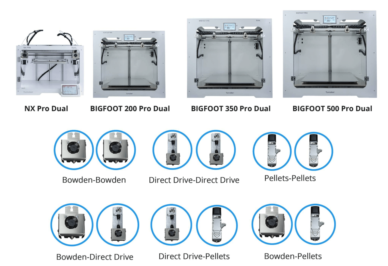 Die 3D-Drucker-Reihe Pro Dual enthält vier verschiedene Modelle: NX Pro Dual, BIGFOOT Pro Dual, BIGFOOT 350 Pro Dual und BIGFOOT 500 Pro Dual. Mit einem Bauvolumen von 500 x 500 x 500 mm ist der 500 Pro Dual der größte 3D-Drucker der Pro Dual – Reihe. Die einzelnen Systeme haben einen 32-Bit-Prozessor, Wi-Fi-Konnektivität, einen Filament-Runout-Sensor und einen 5-Zoll-Touchscreen.