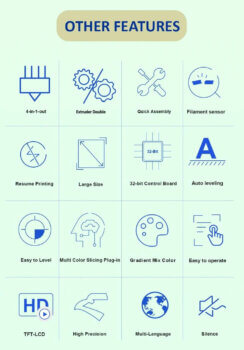 Erweiterte Funktionen: Der Drucker bietet fortschrittliche Funktionen wie Filamenterkennung, Druckfortsetzung nach einem Stromausfall und automatisches Nivellieren des beheizten Bettes, was den Druckprozess zuverlässiger und benutzerfreundlicher macht.