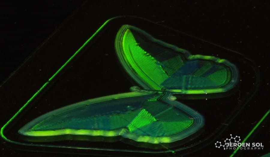 Forscher des Fachbereichs Chemieingenieurwesen und Chemie der TU/e haben mit TNO, DSM, dem Brightlands Materials Center (im DynAM-Konsortium) und SABIC eine von der Natur inspirierte Tinte auf Flüssigkristall-Elastomerbasis entwickelt, die über Direct-Ink-Writing in 3D gedruckt werden kann.