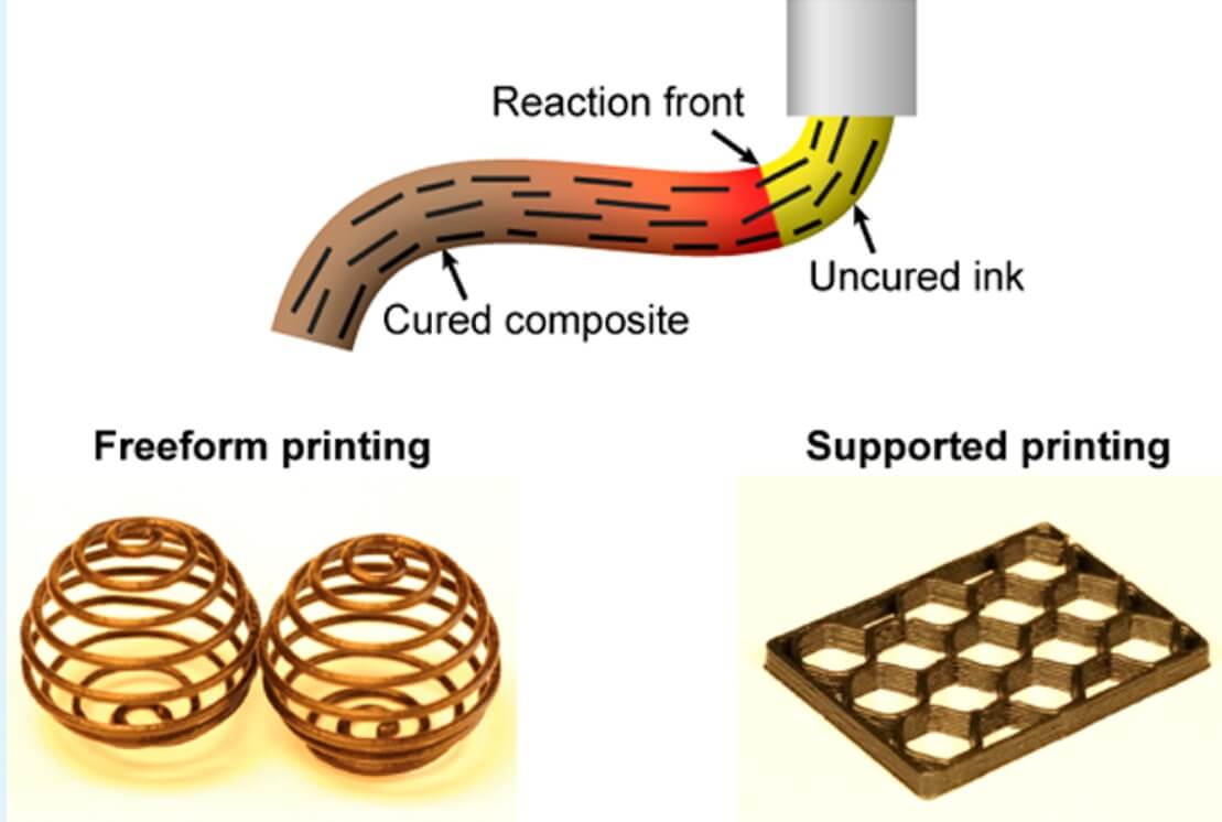 Die niedrigviskosen wärmeempfindlichen Materialien werden durch direktes Tintenschreiben (Direct Ink Writing) extrudiert und bieten überlegenere thermomechanische Eigenschaften gegenüber ihren Gegenstücken aus FFF-Filamenten. Bei duroplastischen Materialien gab es in der Vergangenheit aber Verarbeitungsprobleme mit Aushärtungsraten. Vor zwei Jahren haben Forscher für ihr LITA-3D-Druckverfahren neue Verbundwerkstoff aus duroplastischen Polymeren mit Kohlenstofffasern vorgestellt. 3D-gedruckte Teile aus duroplastischem Harz können mit UV- oder sichtbarem Licht ausgehärtet werden, aber photohärtbare Varianten haben keine ausreichend hohe Aushärtungsgeschwindigkeit, um die ursprüngliche gedruckte Geometrie beizubehalten, weshalb sie Stützen benötigen. Ein thermischer Härtungsmechanismus würde sehr hohe Umgebungstemperaturen erfordern, wie zum Beispiel das Innere eines Ofens. Keiner dieser Ansätze hat sich bisher beim 3D-Druck trägerloser Freiformgeometrien bewährt.