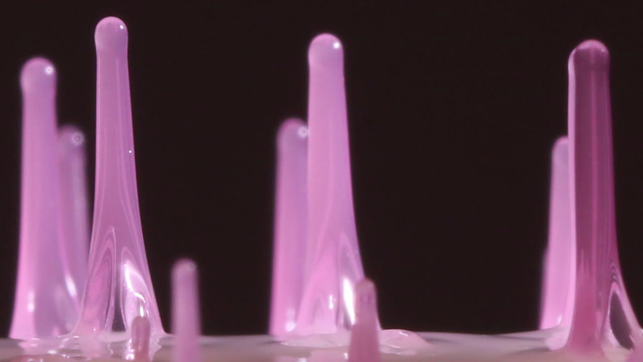 Auf der Außenseite der Scheibe wird flüssiges Gummiband aufgetragen und die Scheibe so gedreht, dass sich darauf komplexe und nützliche Muster bilden. Wenn die Drehungen genau richtig vorgenommen werden, steigen aus dem Material winzige Spindeln beim Aushärten auf. Mit der Beschleunigung der Scheibe wachsen die Spindeln und bilden einen weichen, haarartigen Feststoff.