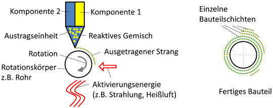 Der Fertigungsuntergrund (zum Beispiel ein Rohr) rotiert simultan zum Materialaustrag. Der Strang aus dem reaktiven Gemisch wird ausgetragen und abgelegt. So kann das Material kontinuierlich und simultan zum Materialaustrag durch zusätzliche Aktivierungsenergie vernetzt werden und der Vernetzungsprozess wird gezielt kontrolliert. Im Grunde kann der Vernetzungsprozess ohne zusätzliche Aktivierungsenergie rein chemisch ablaufen.