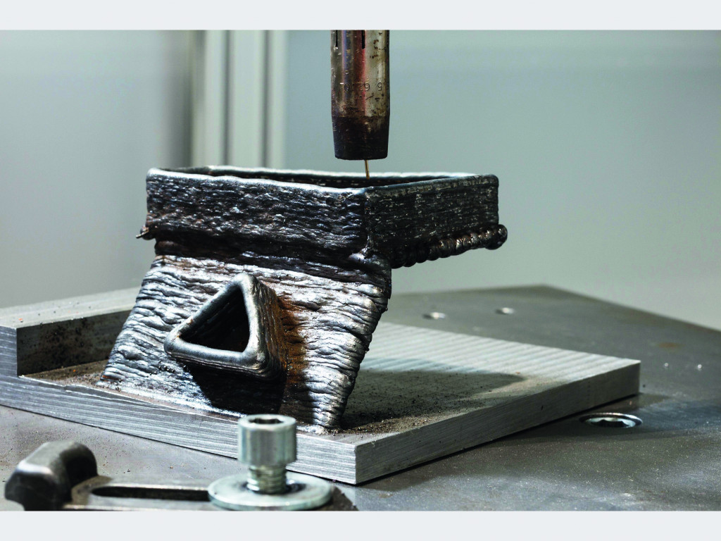 Durch Wire Arc Additive Manufacturing (WAAM – Lichtbogendrahtauftragsschweißen) kann die am Produktionstechnischen Zentrum der Leibniz Universität Hannover (PZH) umgesetzte Roboterschweißzelle komplette Bauteile aus Stahl und Aluminium per 3D-Druck herstellen. Im Vergleich zu anderen Methoden wie dem Selektiven Laserschmelzen können mit WAAM größere Komponenten schnell mit einem Materialauftrag mit dem aufgeschmolzenen Schweißdraht additiv aufgebaut werden.