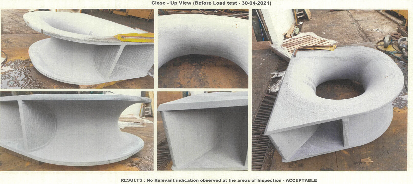 Beim WAM-Prozess von AML3D wurde das Drahtvormaterial ER70S-6 eingesetzt, dass zu einer Materialstreckgrenze führte, die doppelt so hoch wie die des ursprünglichen Gussmaterials war. Verschiedene zerstörungsfreie Prüf- und Bewertungsmethoden zeigten die akzeptable innere Festigkeit des Panama Chocks. Es hielt einer 20% höheren Belastung als der Konstruktionsarbeitslast in einem Test stand.
