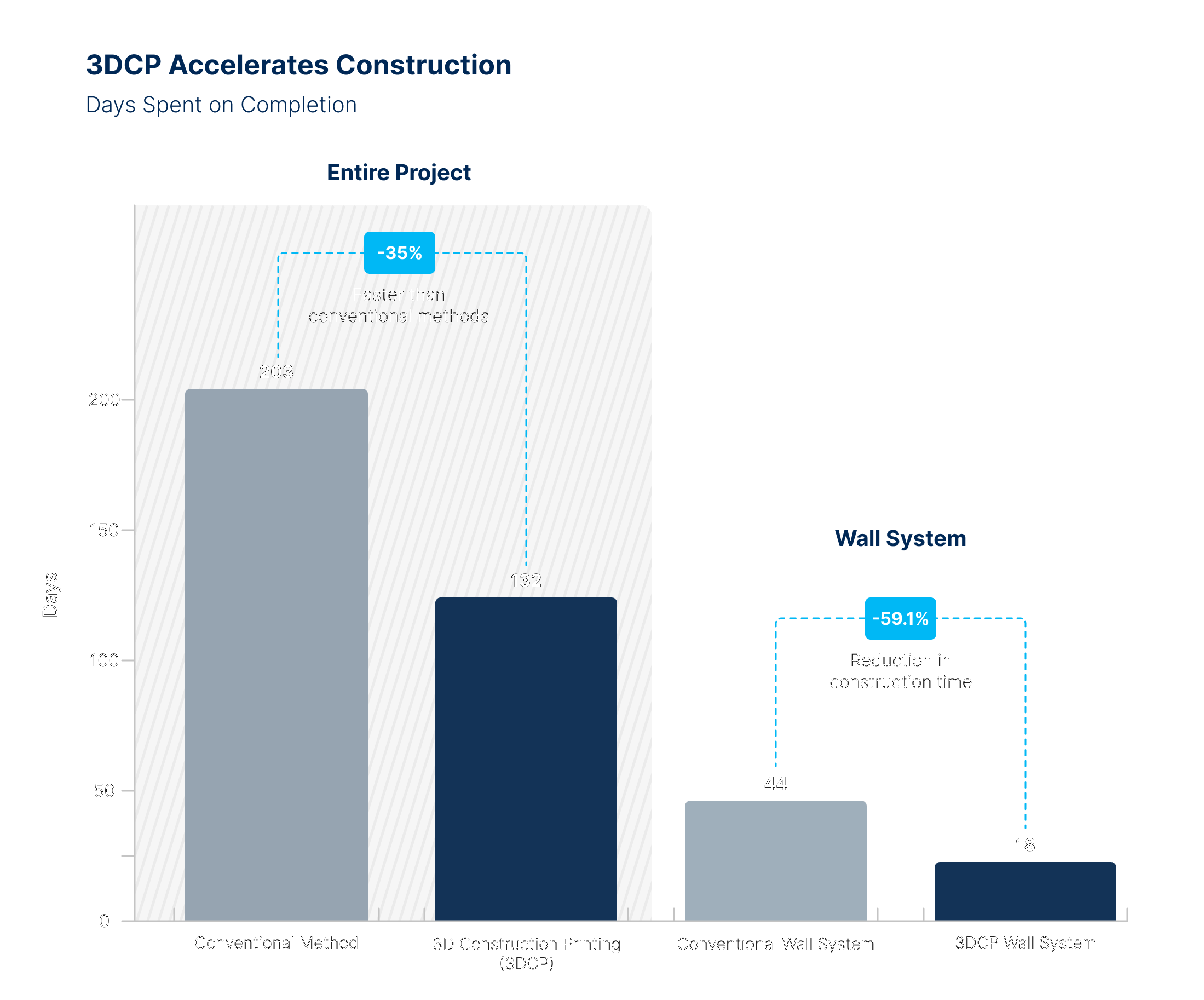 Insgesamt wurden für die Struktur 90 m³ Beton verwendet, wobei die eigentliche Druckzeit für die Wände nur 12 Tage betrug. Zusammen mit Einrichtung und Abbau des Druckers sowie dem Gerüst wurde die gesamte tragende Struktur innerhalb von nur 18 Tagen fertiggestellt.