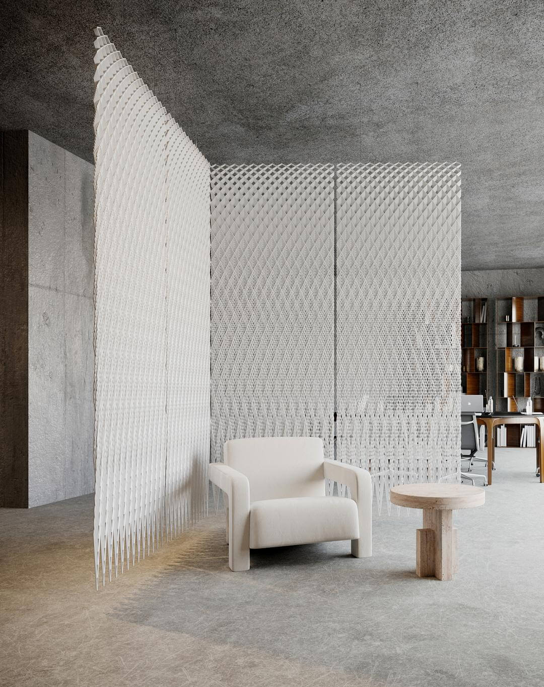 Das von präkolumbianischen Mustern inspirierte Screendesign hatte ein dynamisches Rechteckraster und abwechselnd diagonale Scheiben. Das Ergebnis wurde Teil der Kollektion von Aectual. Das Unternehmen erklärt, dass die Screens auch einzeln stehen und als Raumteiler oder Sonnenschutz geeignet wären.
