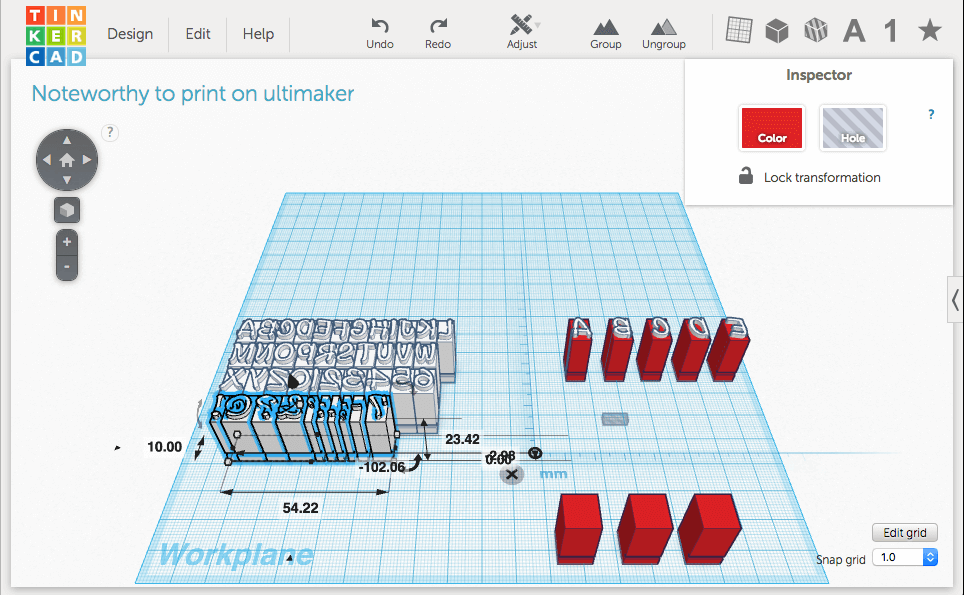 Nun müssen noch die Buchstaben als 3D-Modell am Computer für den Druck entstehen. Dafür bekamen die Kinder eine Einführung in die Betaversion des Tinkercad Programms. Nach einigem üben, bekam jeder Schüler ein paar Buchstaben zugeteilt. Diese mussten gespiegelt werden (damit sie nachher für die Druckpresse verwendet werden können) und um sie setzen zu können, benötigen die Buchstaben eine gewisse Höhe.