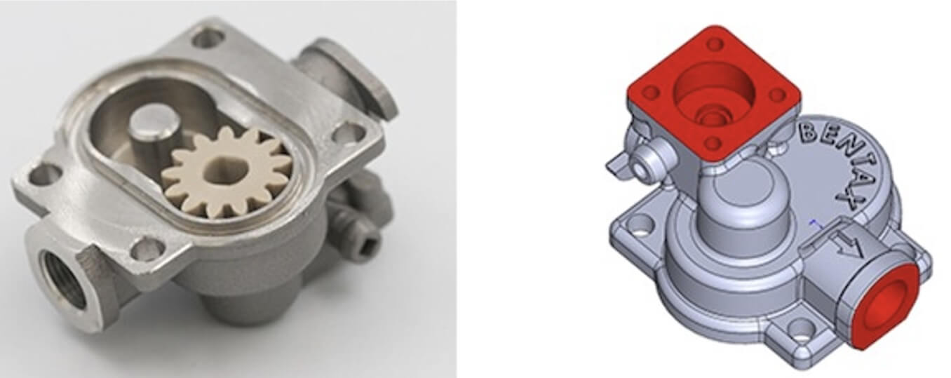 Die Zahnräder und das kleine Gehäuse ist das häufigste Problem bei den Milchpumpen. Die Zahnräder schneiden mit der Zeit in das Gehäuse ein und hinterlassen Spuren. Dadurch kann die Pumpe nicht mehr das gewünschte Ergebnis liefern. Sie scannten die gesamte Pumpe am Danish Technological Institute und haben sie vermessen, um eine digitale Kopie zu erhalten. Anschließend haben sie sie in Edelstahl mit einem Metall-3D-Drucker gefertigt und sie bis auf die gewünschten sehr feinen Toleranzen nachbearbeitet. Die Zahnräder waren für den 3D-Druck nicht geeignet.