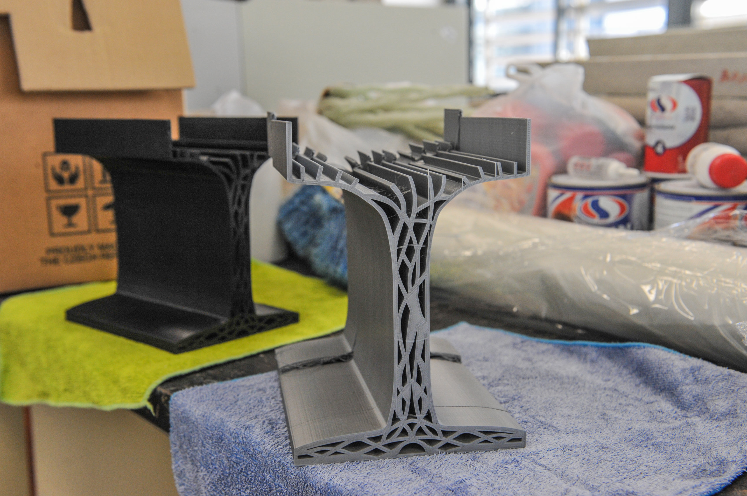 Die entwickelten Träger verwenden recycelten Kunststoff als Rohmaterial. Sie können vor Ort gedruckt und montiert werden. So wiegen sie bis zu 80% weniger als normale Bewehrungsbalken. Die Träger sind nachhaltiger und einfacher zu montieren und zu transportieren.