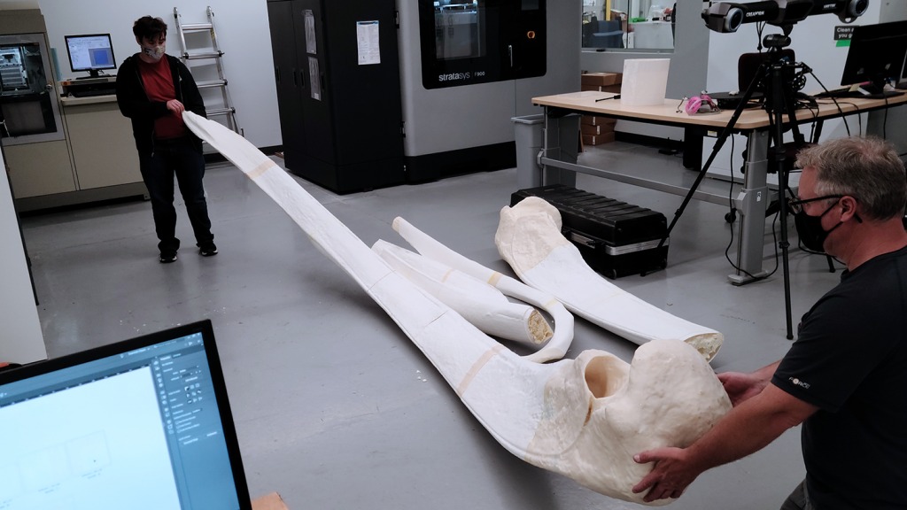 Die Walknochen werden mit dem industriellen großformatigen 3D-Drucker F900 von Stratasys gedruckt. Ein Kieferknochen ist zum Beispiel 4,27 Meter lang. Der F900 hat ein Bauvolumen von 914 x 610 x 914 mm und verarbeitet 16 verschiedene Hochleistungsmaterialien. Das Team verwendet für die nachgebildeten Walknochen weißes ABS-M30 und druckt Skelettteile in 1,5 mm dicken Schalenabschnitten. Dann füllen sie den Kern mit expandierbarem Schaum und verbinden die Teile mit ABS-Sanitärkleber.