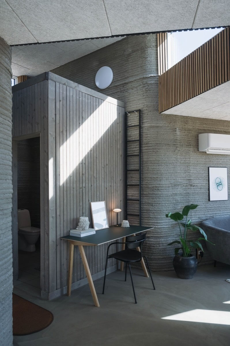 Das Gebäude ist durch einen offenen Mittelkern verbunden und hat die Form eines dreieckigen Kreises. An jeder Ecke befindet sich ein Zimmer. Das Dach wurde über dem Ende des Dreiecks schwebend angeordnet, damit das Schlafzimmer Platz hat. Das Haus wurde mit dem 3D-Konstruktionsdrucker BOD2 mit kostengünstigem Echtbeton gedruckt und ist das Erste seiner Art in Europa. COBOD hat zu Beginn des Jahres einen Online-Simulator für den 3D-Druck von Häusern vorgestellt.