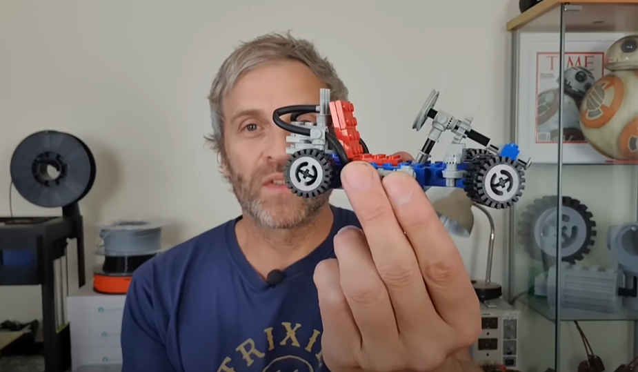 Um die Teile in der richtigen Größe auszudrucken, erstellte er zuerst ein Design in seinem CAD-Programm. Dort konnte er die einzelnen Stücke nach belieben anpassen, drehen und skalieren. Das Go-Kart basiert auf dem Modell Nummer 1972 von LEGO, das 1985 veröffentlicht wurde.