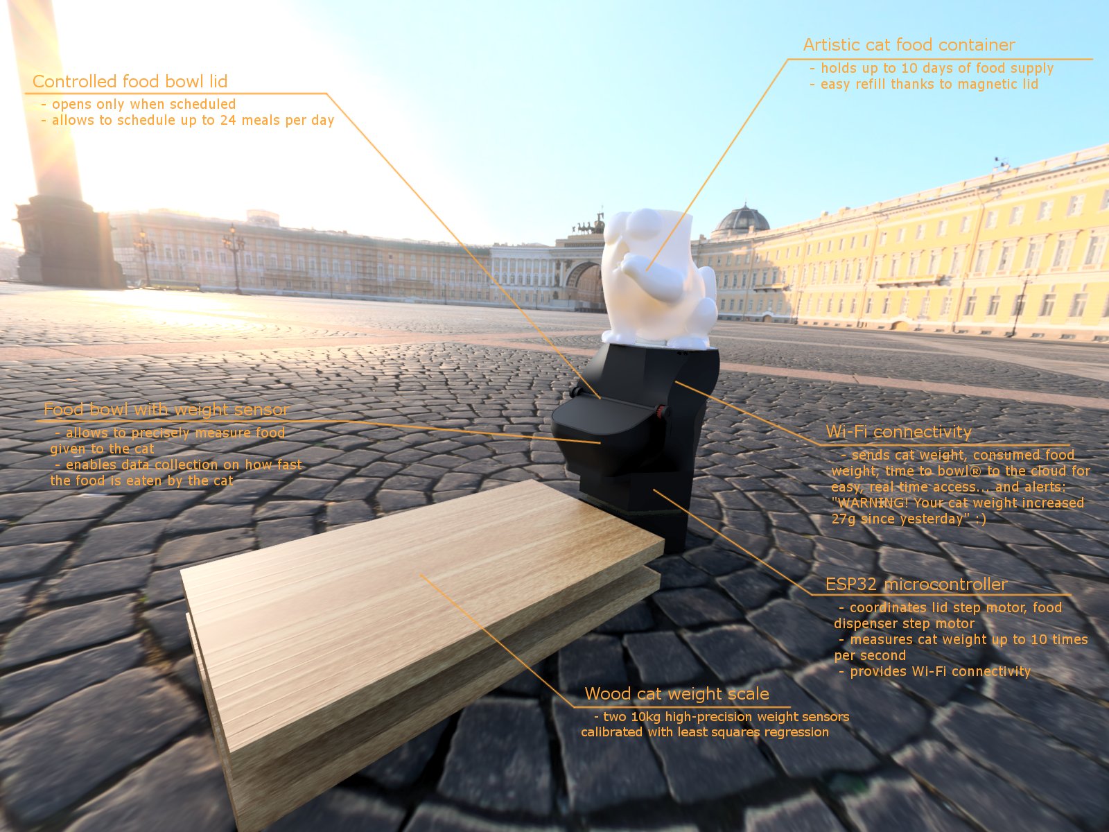Es dauert täglich drei Minuten, eine Katze zu füttern. Davon geht zumindest Piotr Westfalewicz aus, der eineinhalb Jahre an einem automatischen Apparat zur Katzenfütterung gebaut hat. Dieser erfasst das Gewicht und die Fressgeschwindigkeit der Katze und ist zu großen Teilen mit einem 3D-Drucker gedruckt.