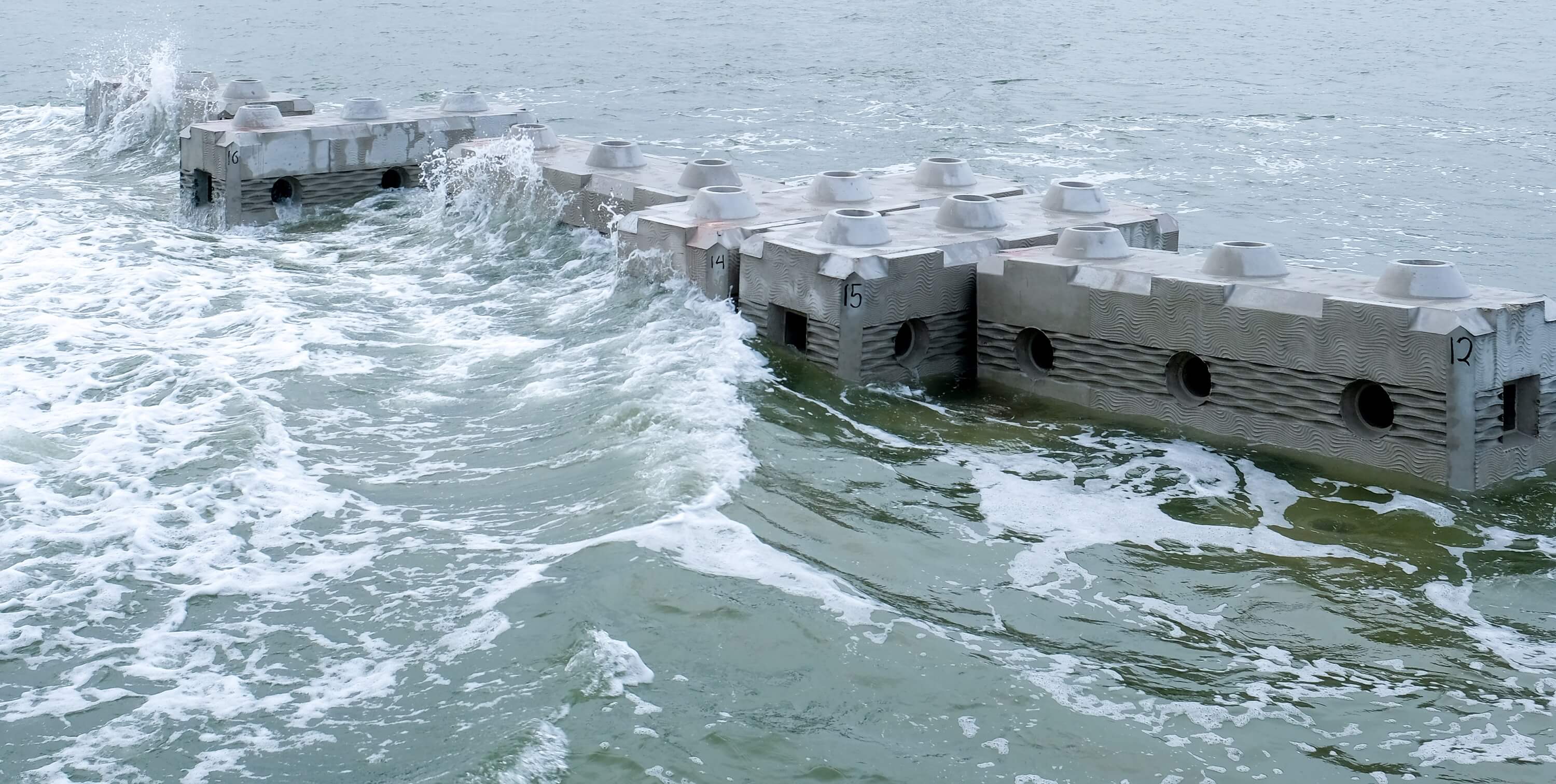 Reefy, ein junges Öko-Engineering-Unternehmen aus den Niederlanden, kombiniert Biologie und Wasserbau, um mit naturnahen Lösungen Küstenschutz- und Offshore-Windprojekte zu entwickeln. Die ReefBlocks sind massive „Lego-ähnliche“ Blöcke, die hydrodynamisch entworfen und im Deltares-Wellenkanal getestet wurden. Die stabile Struktur, die durch das Zusammenfügen der Blöcke unter Wasser entsteht, leitet die Wellenenergie ab und schafft ein Unterwasserlabyrinth, in dem Fische und andere Arten Unterschlupf finden und sich fortpflanzen können. Die Blöcke aus nachhaltigem Beton haben eine spezielle Textur auf der Oberfläche.