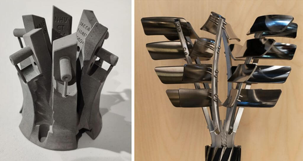 Der Zeremonienstab, der für die Ingenieursfakultät der Yale University entworfen wurde, steht für die Entwicklung vom traditionellen Handwerk hin zu modernen Fertigungsmethoden. Der Aufbau des Stabs beginnt mit einem handgeschnitzten Holzsockel, auf den Messing- und Kupferelemente folgen. Diese gehen in zunehmend komplexere Formen über, die aus Aluminium und Edelstahl mittels CNC-Bearbeitung und fortschrittlichen 3D-Druckverfahren hergestellt wurden. Das von Incus gefertigte Bauteil, das sich in der Nähe des oberen Teils des Stabs befindet, symbolisiert die Zukunft des Ingenieurwesens. An dieser Stelle verzweigt sich der Stamm des Baums, und das additiv gefertigte Bauteil spielt eine entscheidende Rolle für die Stabilität der Struktur und demonstriert die Fähigkeiten der Technologie von Incus.