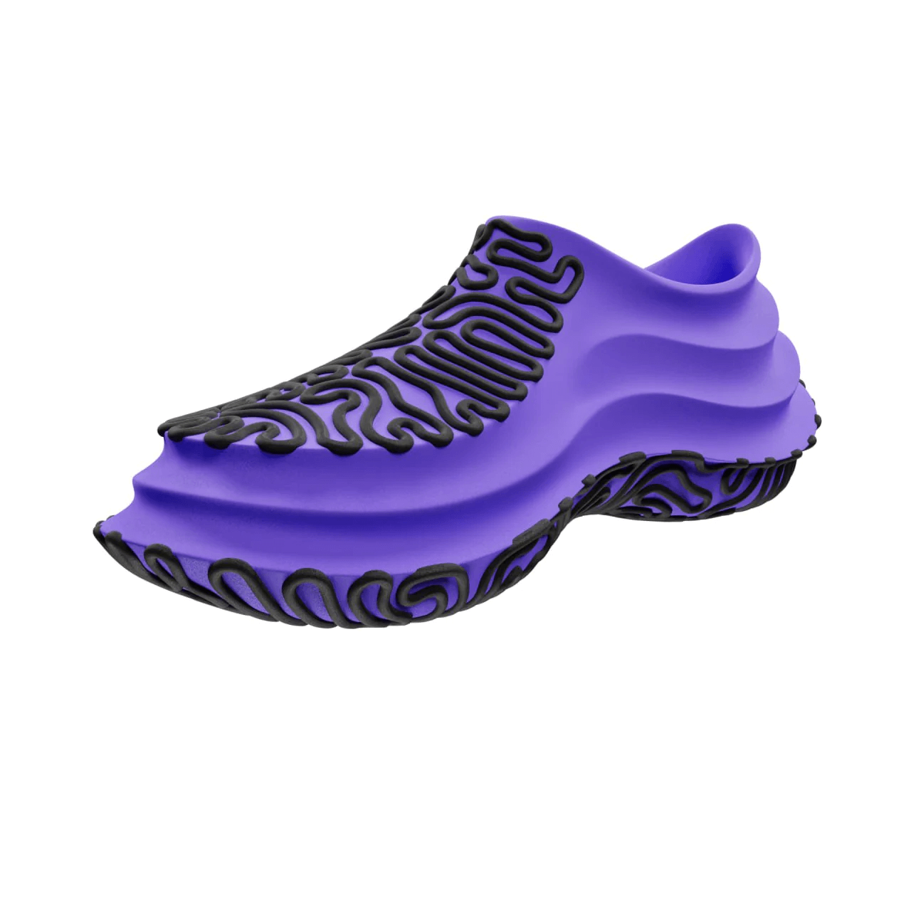 Die komfortablen waschbaren Schuhe sehen nach dem Reinigen mit Seifenwasser und einem Tuch jedes Mal wie neu aus, wie Koobz erklärt. Die Details aus eingespritztem, recycelbarem thermoplastischen Polyurethan sind aus der Nähe sichtbar und verleihen dem Schuh einen unverwechselbaren Charakter. Koobz und De Lucia entschieden sich für ein zweifarbiges, wellenförmiges Schuhdesign, um kontrastierende Paletten zu schaffen, die sich gut ergänzen.
