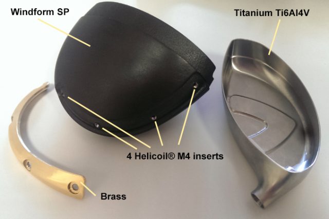 Die Struktur des KD-1 entstand per Laser-Sintering-Verfahren und dem Windform SP Additive Manufacturing-Material. Windform SP ist besonders widerstandsfähig und kann stark gedehnt werden. Vier Helicoil M4-Einlagen im Körper dienen der Festhaltung des Gewichts und die schlagende Oberfläche am Schlägerkopf besteht aus der leichten Titanlegierung Ti6AI4V.