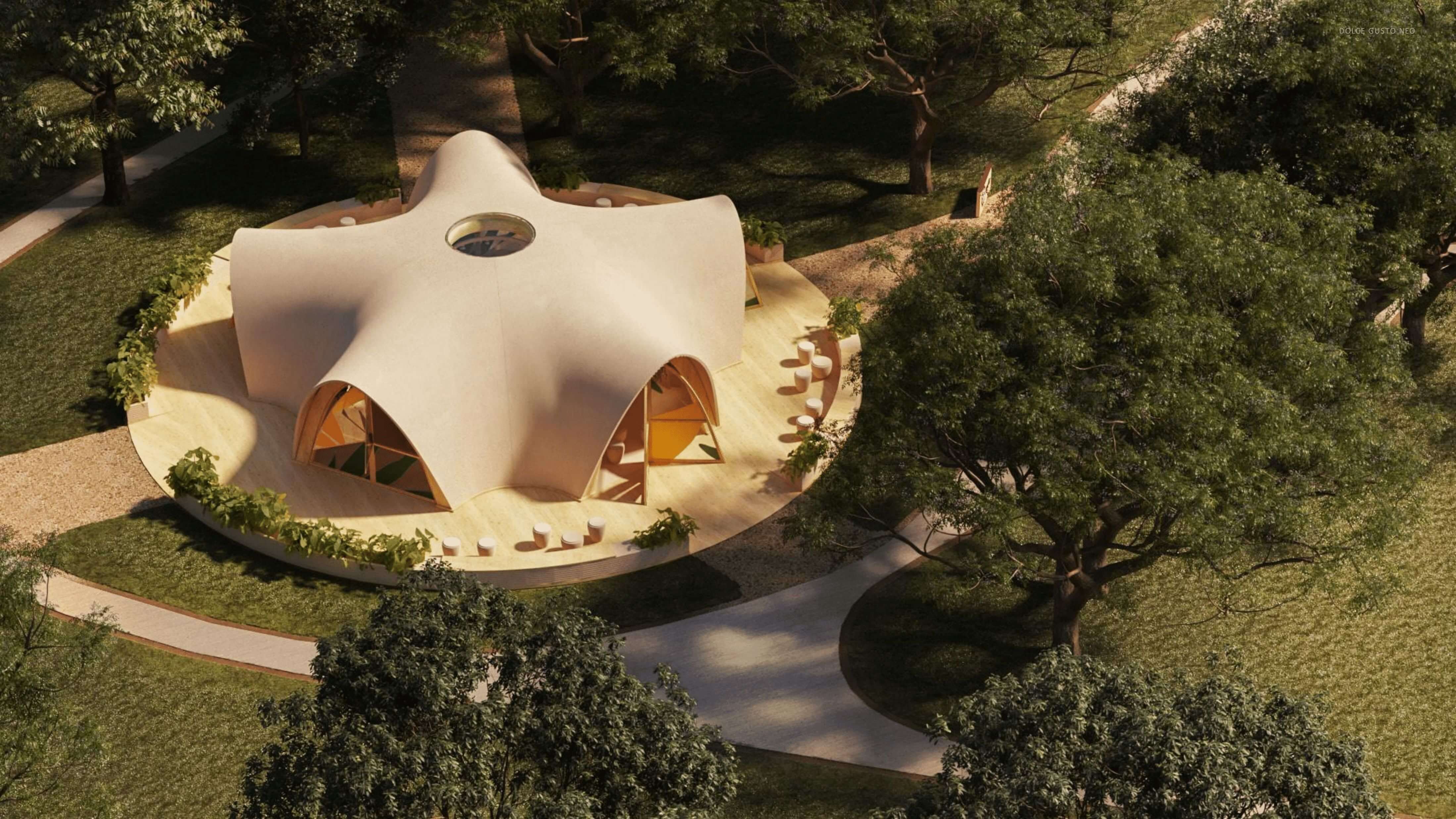 Das Design des Gebäudes orientiert sich an den fünf Blütenblättern der Kaffeepflanze. In der Mitte des Raumes schafft ein runder Oberlichteinfall eine Atmosphäre, die an ein Tempel erinnert. Der Innenraum ist durch fünf gleichgroße Eingänge zugänglich und bietet durch Glasfronten einen 360-Grad-Blick auf den umliegenden Park.