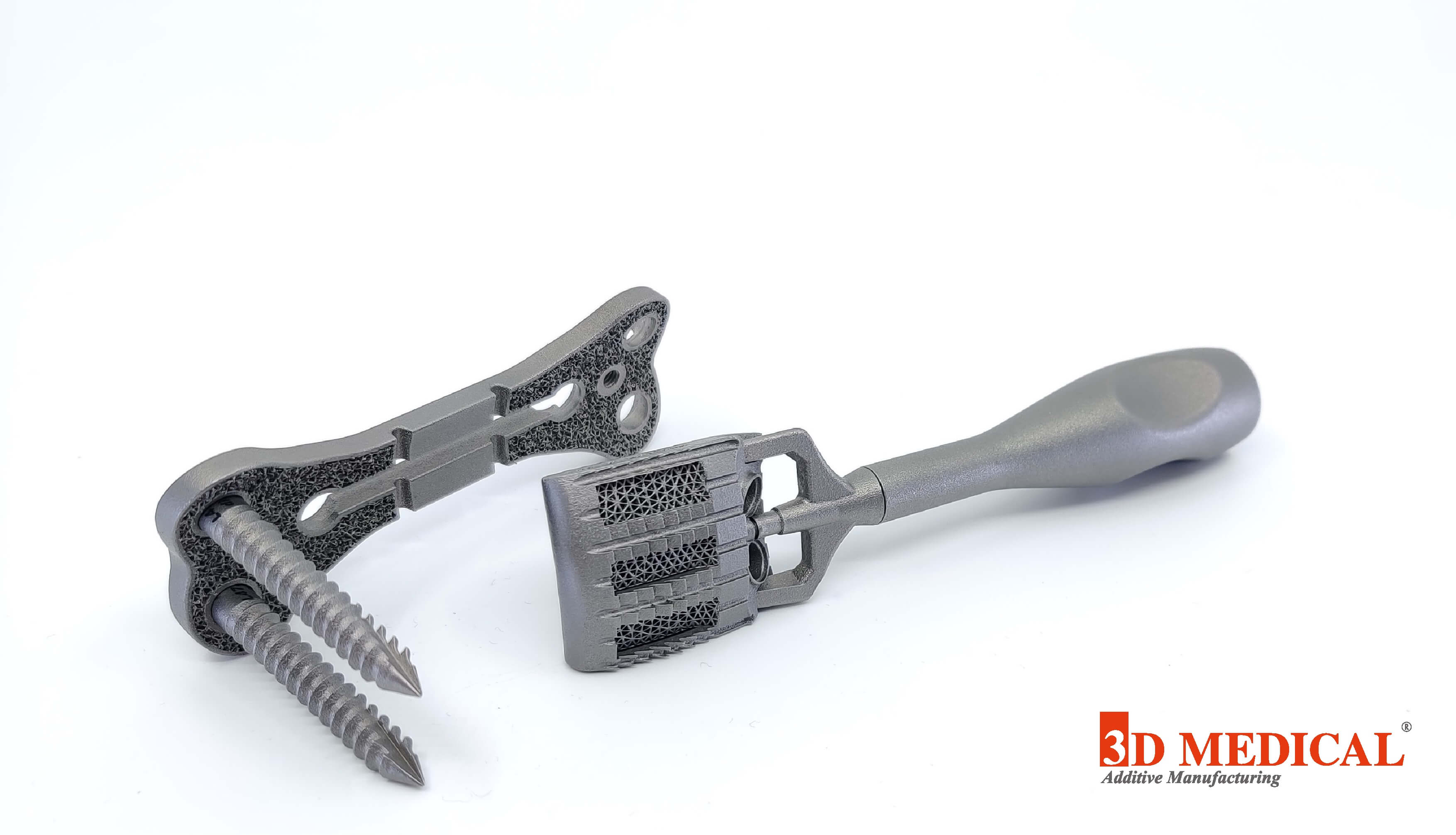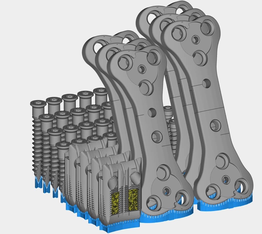 Die Form der Platte ermöglicht die Platzierung der drei Schrauben in jedem Wirbel. Titan-Implantate ermöglichen eine bessere Osseointegration als Stahlimplantate. Mit dem Metall-3D-Druck können poröse Strukturen angefertigt werden, die das durch den Cage hindurch und die Fixierung des Knochens am Cage erleichtern.