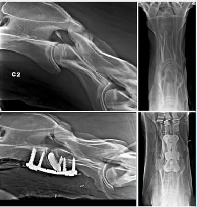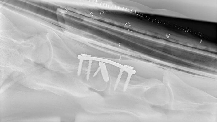 Zur Kompression des gebrochenen Fragments wird manchmal eine Kombination aus Spongiosa- oder Kortikal- und Verriegelungsschrauben verwendet. Dadurch kann ein mit 3D-Druck hergestellter Bandscheiben-Spacer aus Titan mit seiner Kompressionskraft den Abstand zwischen den Wirbeln aufrechterhalten. Das verhindert, dass die Bandscheibe in den Markkanal ragt und der kaudale Wirbel sich ventral verschiebt.