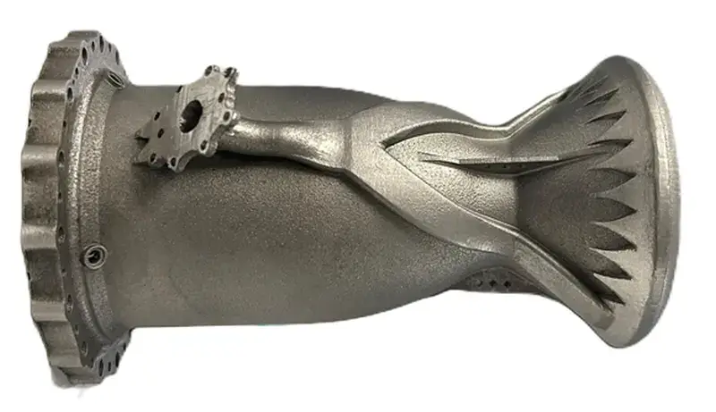 Der von Wipro 3D additiv gefertigte PS4-Raketentriebwerk des Polar Satellite Launch Vehicle (PSLV) zeigt die fortschrittliche Fertigungstechnologie, die in Zusammenarbeit mit der Indian Space Research Organisation (ISRO) entwickelt wurde. Das Design beinhaltet komplexe Kühlkanäle und verbessert die strukturelle Integrität des Triebwerks. (Bild © Wipro 3D)