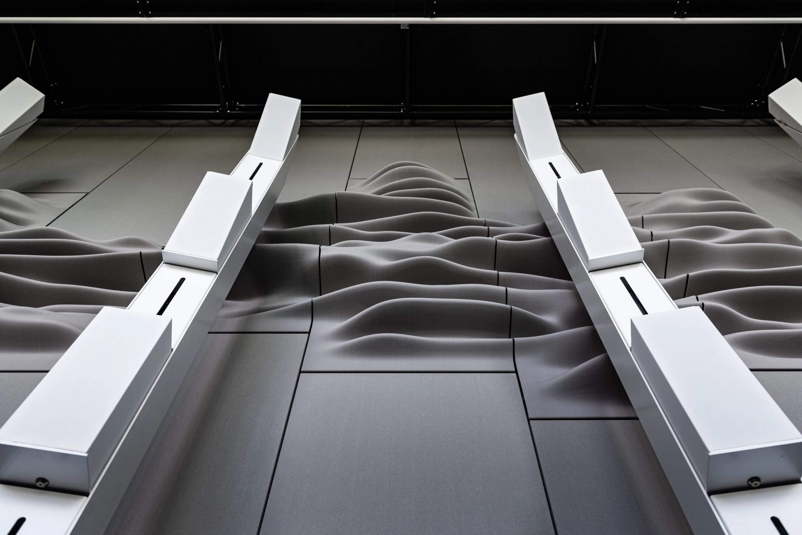 Die Akustikdiffusionsplatten erinnern an Wellen aus der Natur und wurden vom Forschungsteam von Gramazio Kohler konzipiert. Die Struktur der einzelnen Paneele lässt sich je nach Raum individuell generieren. Sie besteht aus einer parametrisch gestalteten Oberfläche, die Schallwellen streut und die Kanten von harten Klängen weich macht.