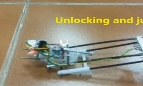 Der Körper der künstlichen Heuschrecke besteht aus ABS-Kunststoff und wurde mit einem 3D-Drucker hergestellt. Bei den Sprungbeinen handelt es sich um steife Karbon-Stäbchen. Die Gelenke sind Torsionsfedern aus Stahldraht.