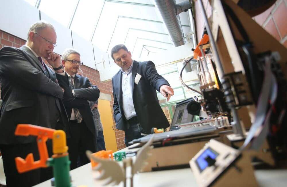 In der Produktionsschule, Bereich Metallverarbeitung, werden die schuleigenen Fahrräder zusammengebaut und das Mittagessen für 100 Schüler in einer Produktionsklasse hergestellt. Nach 90 Minuten endete der Besuch von Ministerpräsident Weil mit einer abschließenden Fragerunde, bei er Schüler-Fragen beantwortete. Eine der Fragen könnten sein, was die niedersächsische Landesregierung in Zukunft dafür tun wird, damit auch andere Schulen ihren Schülern, schon in einer frühen Phase ihrer Bildung, den 3D-Druck und die damit verbundenen Möglichkeiten für die Produktentwicklung nahe bringen. Beispiele für 3D-Drucker an Schulen gibt es jedenfalls schon zahlreich.
