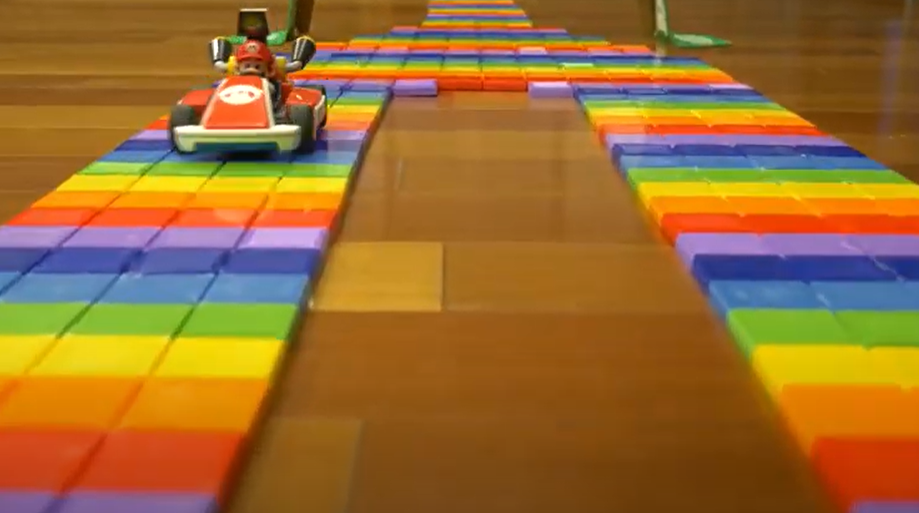 Ein Super Mario im kleinen Rennwagen wurde mit einer Steuerung ausgestattet, die mit einer Nintendo Switch – Konsole verbunden war. Der Test der Strecke war erfolgreich. Mario kam ohne Schwierigkeiten ans Ziel.