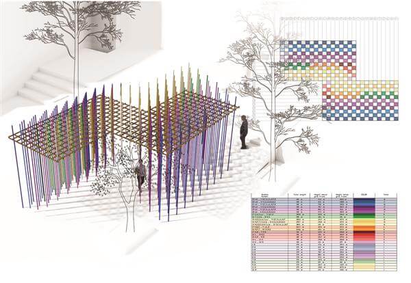 Der Bambuspavillon ist nicht fertig gebaut und soll als Vorschlag für eine neue Bauweise mit Bambus und 3D-Druck gesehen werden. Mit Seilen und speziell gestalteten 3D-Druckgelenken haben die Architekturstudenten im Eingangshof der Architekturabteilung ihre 40 Quadratmeter große Struktur errichtet, die Studierende, Mitarbeiter und Besucher der Universität mit einer beeindruckenden Licht- und Schattenpräsentation begrüßt. Die Gelenke aus dem 3D-Drucker sehen aus wie große, vierschwänzige Spinner und die Studenten haben das gemeinsame Design „The Ninja“ getauft.