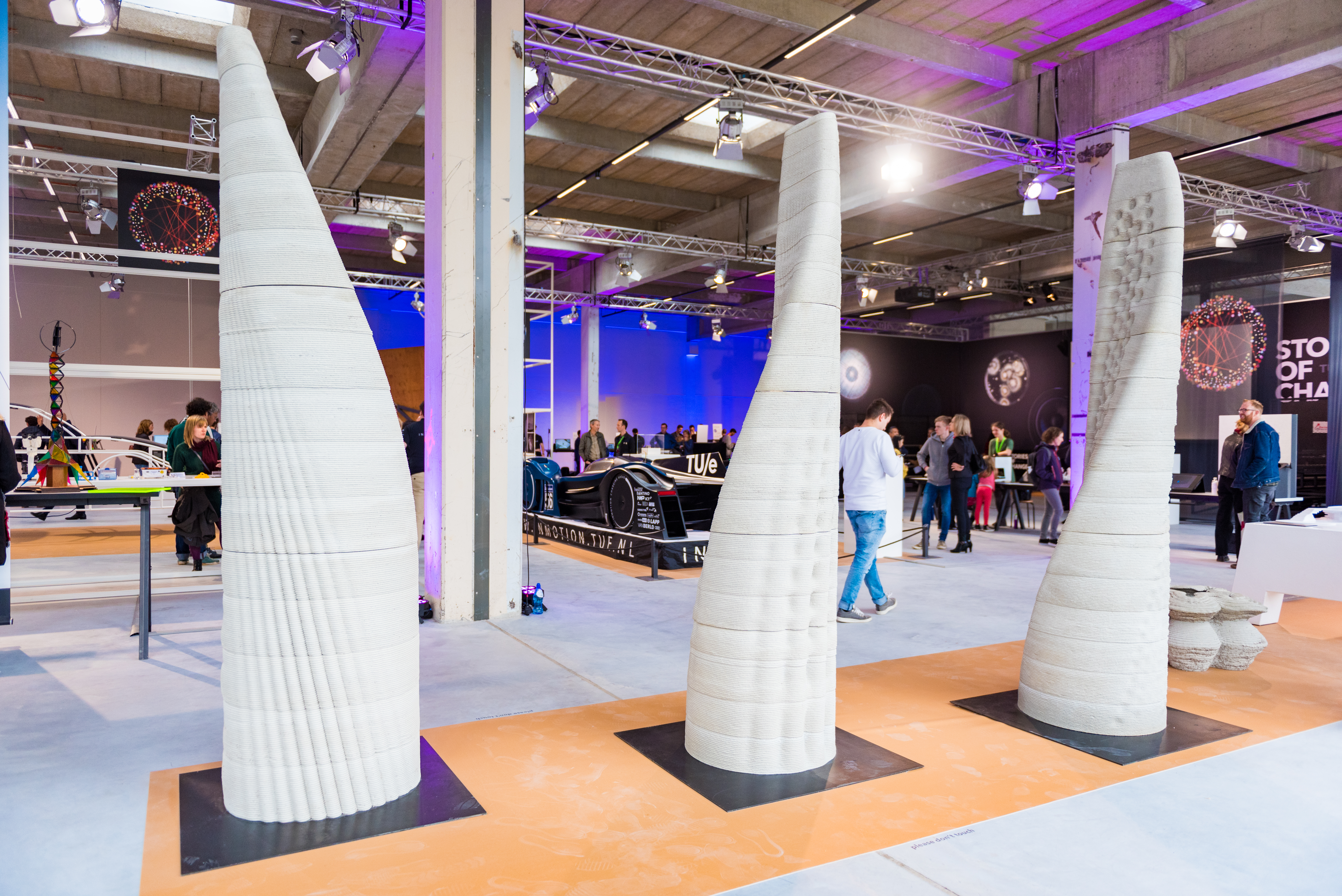 Wie uns das Unternehmen in einer Pressemitteilung berichtet, hat Vertico in seinem neuesten Projekt ebenfalls beeindruckende monolithische Betonsäulen erschaffen. Vertico stellte die übergroßen 3D-Objekte zusammen mit der Abteilung für architektonisches Design und Ingenieurwesen der Technischen Universität Eindhoven auf der Dutch Design Week vor. Die Betonsäulen sollen die Möglichkeiten mit 3D-Betondruck zeigen. Die Säulen sind 300 Kilogramm schwer und drei Meter hoch.