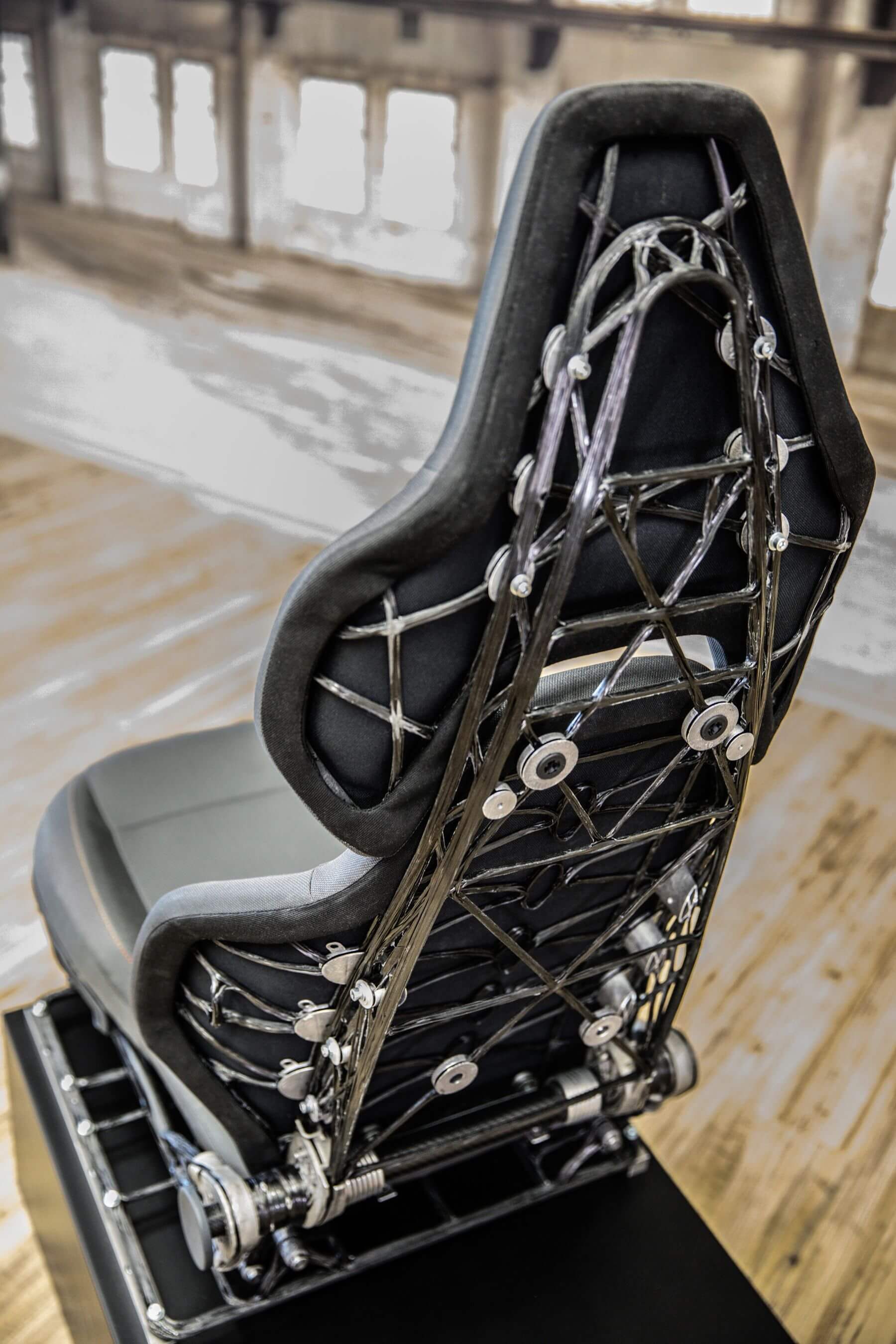 Für den Sitz wurde eine Faserroving-Skelettstruktur entwickelt, die für das geringere Gewicht verantwortlich ist. Sie basiert auf einer „xFK in 3D“-Prozesstechnologie, einem Filamentwickelverfahren. Dabei wird Harz mit imprägnierten Endlosfasern um Stifte gewickelt in einem durch generative Simulationen berechneten Weg. Mit Aluminium 3D-Druck wird die Stiftstruktur für das Wickeln hergestellt. Diese Art der additiven Fertigung verschwendet nur 1% der Fasern im Prozess. Dabei steht ein besonders leichtes Objekt, das an den notwendigen Stellen stark ist.