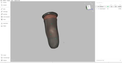 Die Scans wurden ausgerichtet und registriert und schließlich zu einem Objekt zusammengefügt. Anschließend wurde die Textur hochgeladen und auf das Polygonnetz angewendet. In Freeform entwarf Pabst den Prothesenschaft und gestaltete die kosmetischen Elemente des Designs.