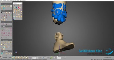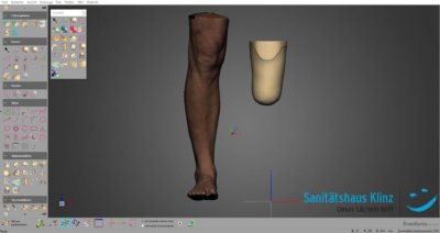 Der Import eines 3D-Scans in Freeform liefert eine verlässliche Grundlage für die prothetische Designarbeit. Artec Eva braucht nur wenige Sekunden, um die exakten Körpermaße eines Patienten zu erfassen. In Geomagic Freeform werden spätere Entwürfe auf der Grundlage dieser Maße entwickelt. Besonders bei der Erstellung eines neuen Prothesenschaftes, der die individuelle Form des Stumpfes eines Patienten perfekt zu umschließen hat, muss jeder Millimeter der Oberfläche digital erfasst und in die Konstruktion einbezogen werden.