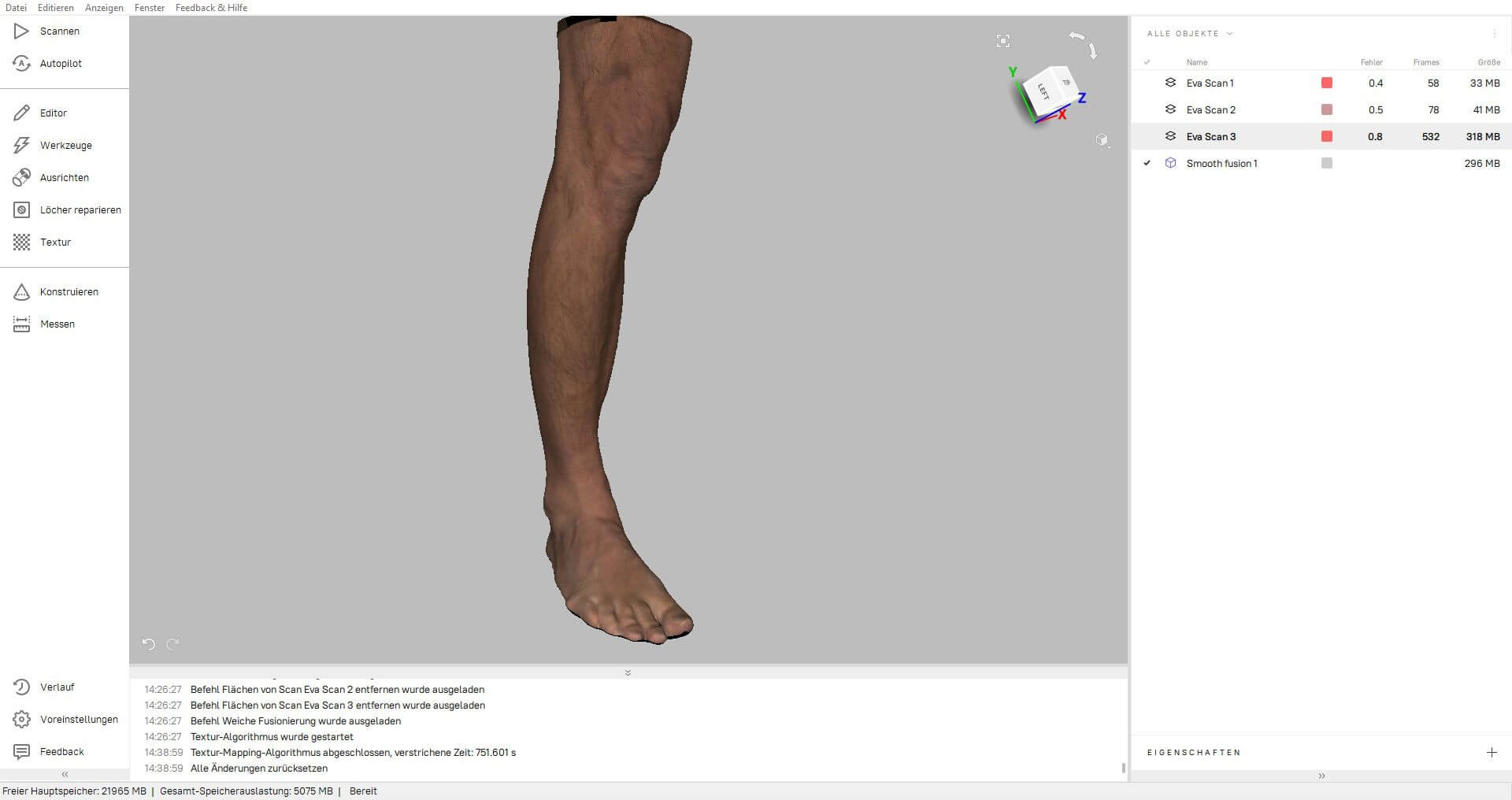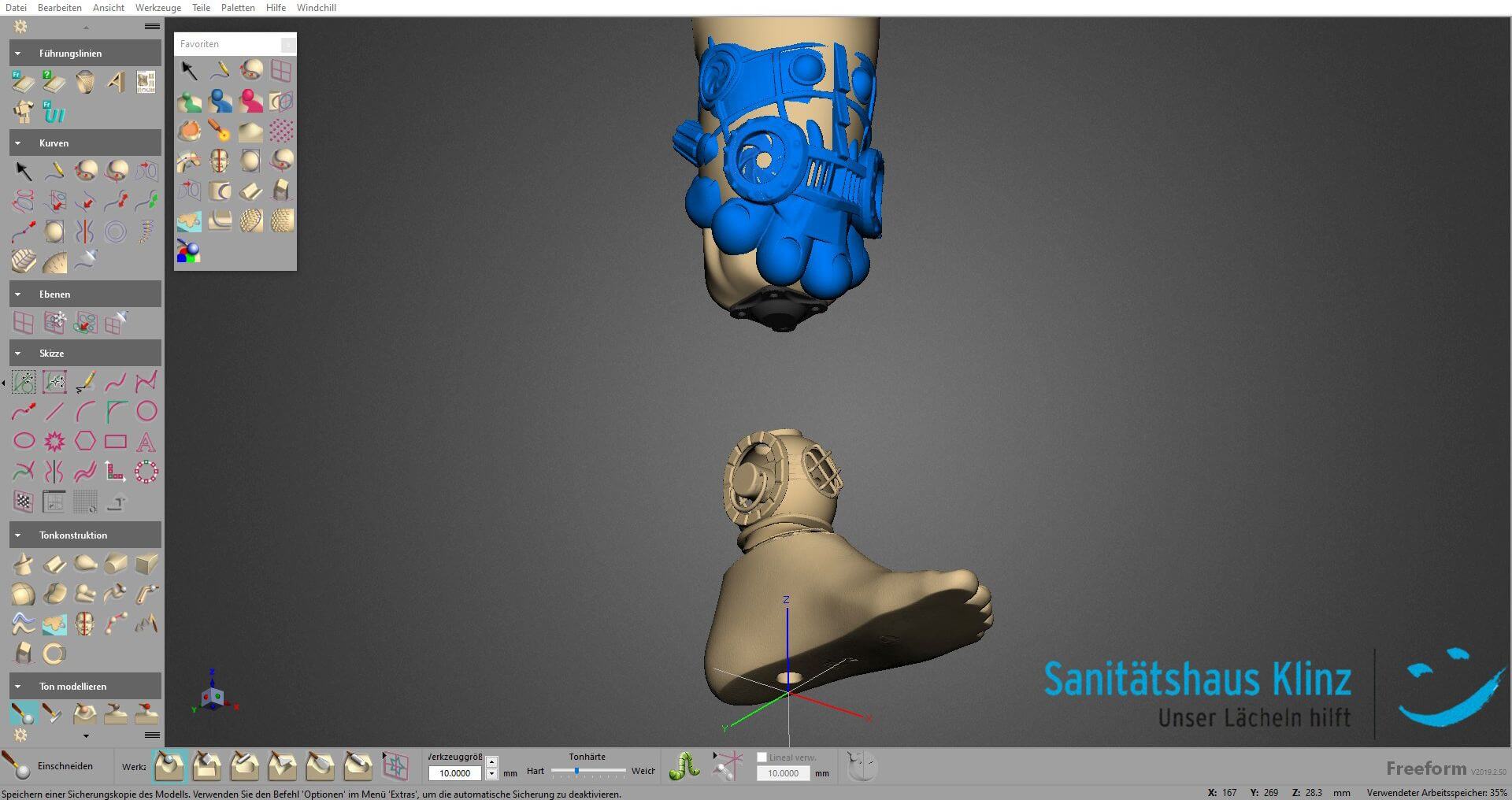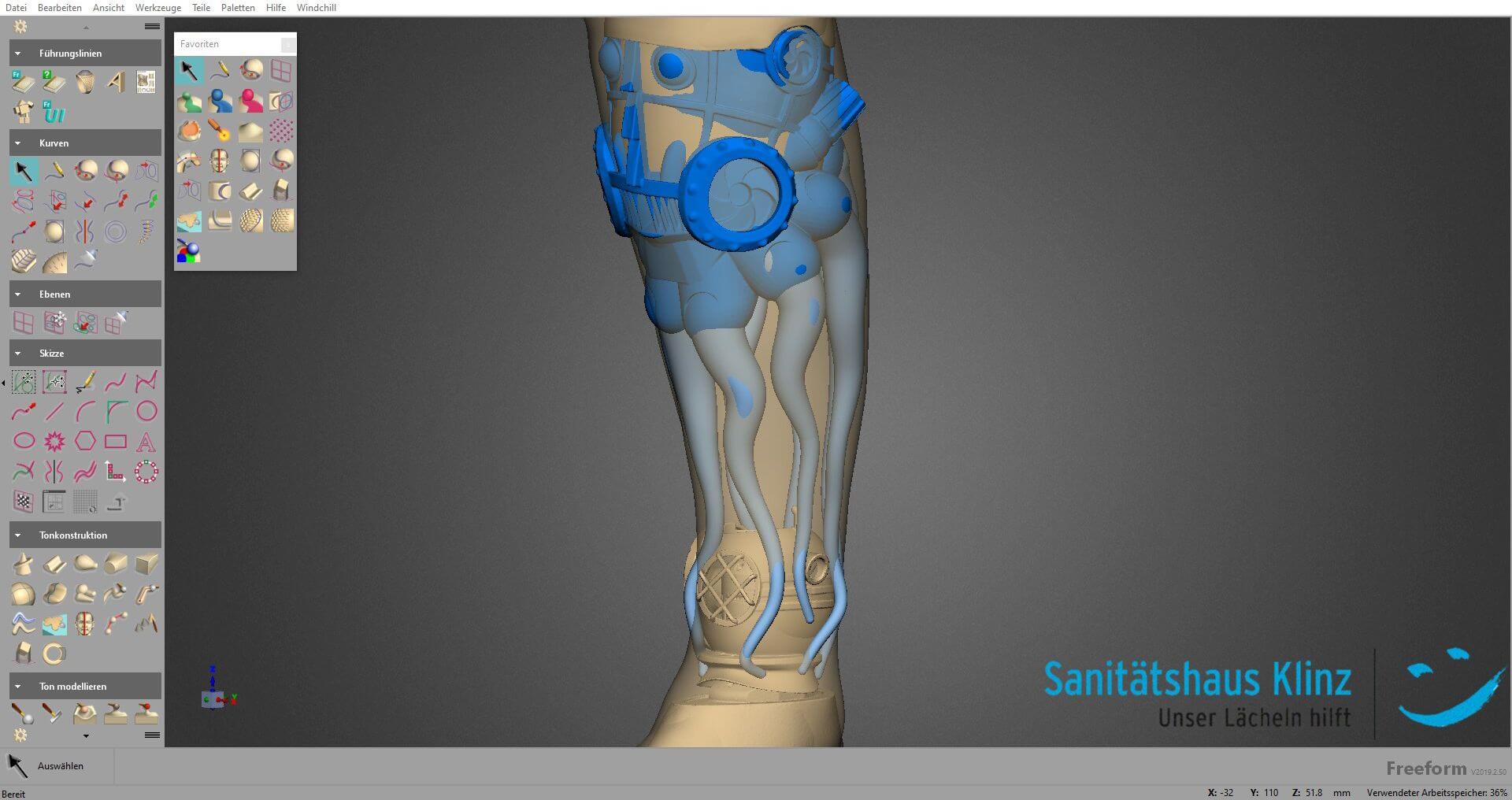 Die Scans wurden ausgerichtet und registriert und schließlich zu einem Objekt zusammengefügt. Anschließend wurde die Textur hochgeladen und auf das Polygonnetz angewendet. In Freeform entwarf Pabst den Prothesenschaft und gestaltete die kosmetischen Elemente des Designs.
