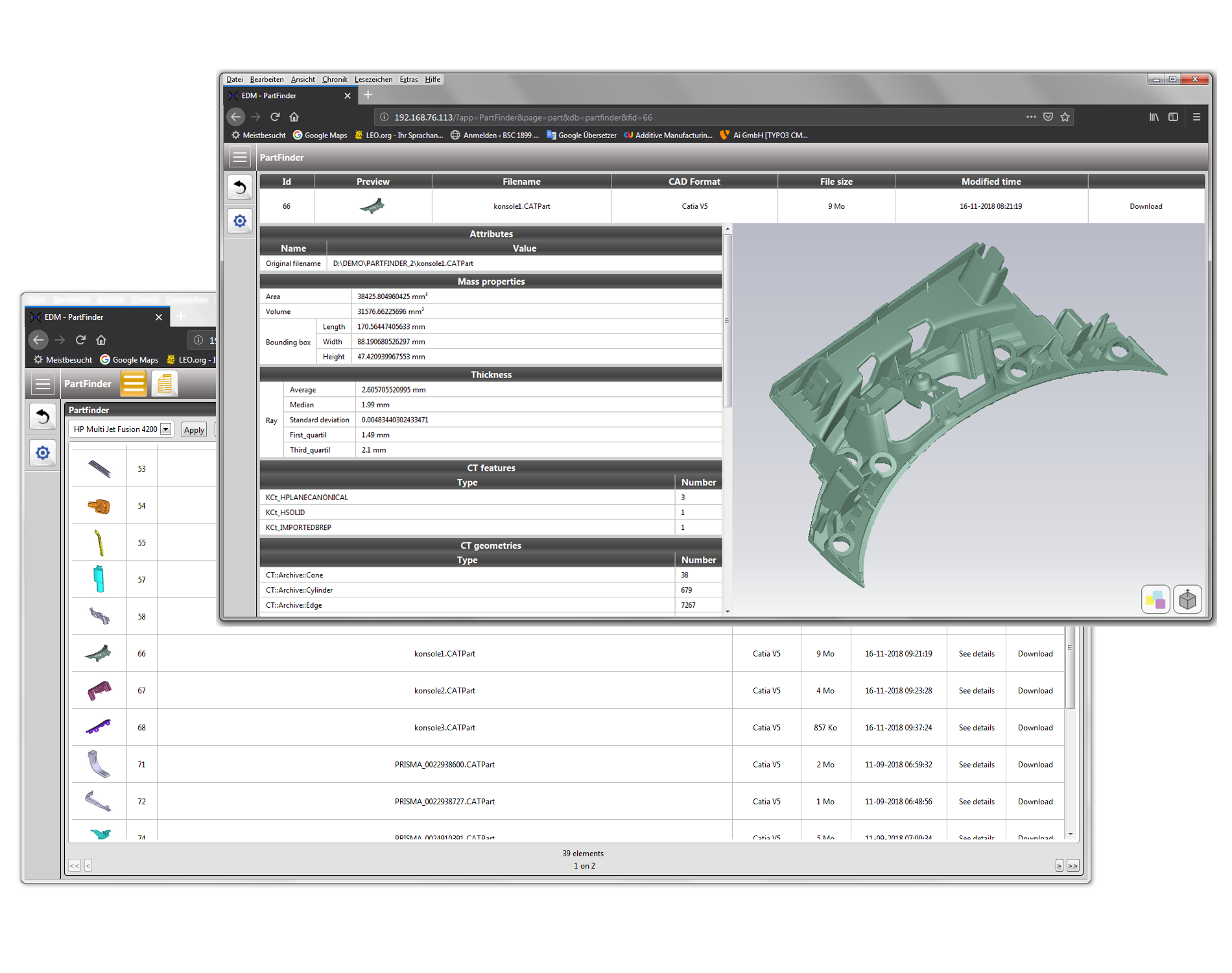 Das auf einer Datenbank basierende Tool identifiziert Bauteile und Komponenten anhand ihrer Geometrie und Attribute, die sich für bestimmte Herstellungsverfahren oder Maschinen eignen. Sie werden automatisch aus dem Datenbestand von 3D Modellen rausgefiltert. Die Partfinder Technologie liest alle Informationen aus der CAD Datei und analysiert Geometrie, Konstruktionshistorie, Bemaßungen und Toleranzen. Zur Einordnung werden maßgebliche, technische Aspekte verwendet. Große Datenbestände lassen sich durch Multiprozessorberechnung in kurzer Zeit untersuchen und in die systemeigene Datenbank schreiben. Anhand vordefinierter Profile werden diese in Sekunden gefiltert.