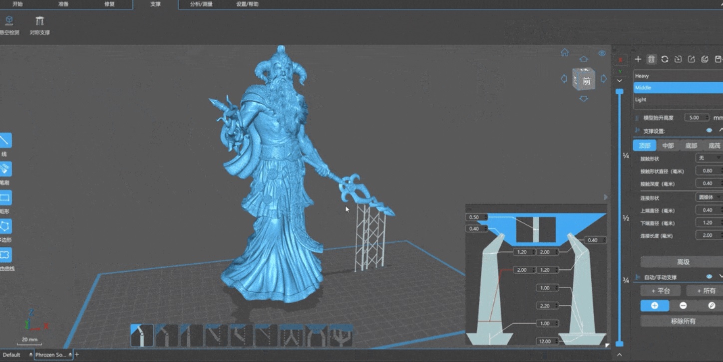 Die verbesserte Leistung beim Schneiden und Speichern von Teilen soll sich auch spürbar auf die Effizienz des 3D-Druck-Workflows auswirken. Die überarbeitete Inselerkennungsfunktion bringt höhere Teilequalitäten. Die neueste Version der CHITUBOX ist mit einem verbesserten automatischen Unterstützungsalgorithmus ausgestattet. Das erhöht die Erfolgsraten beim Bau erheblich, da Überhänge und Inseln besser erkannt und zusätzliche Querverstrebungsstrukturen für riskante Bereiche von Teilen automatisch generiert werden. Das einfache Drücken der Tabulatortaste erlaubt es den Benutzern auch, sofort zwischen den voreingestellten Supporteinstellungen zu wechseln. Gleichzeitig lassen sich Unterschiede in Echtzeit visualisieren.