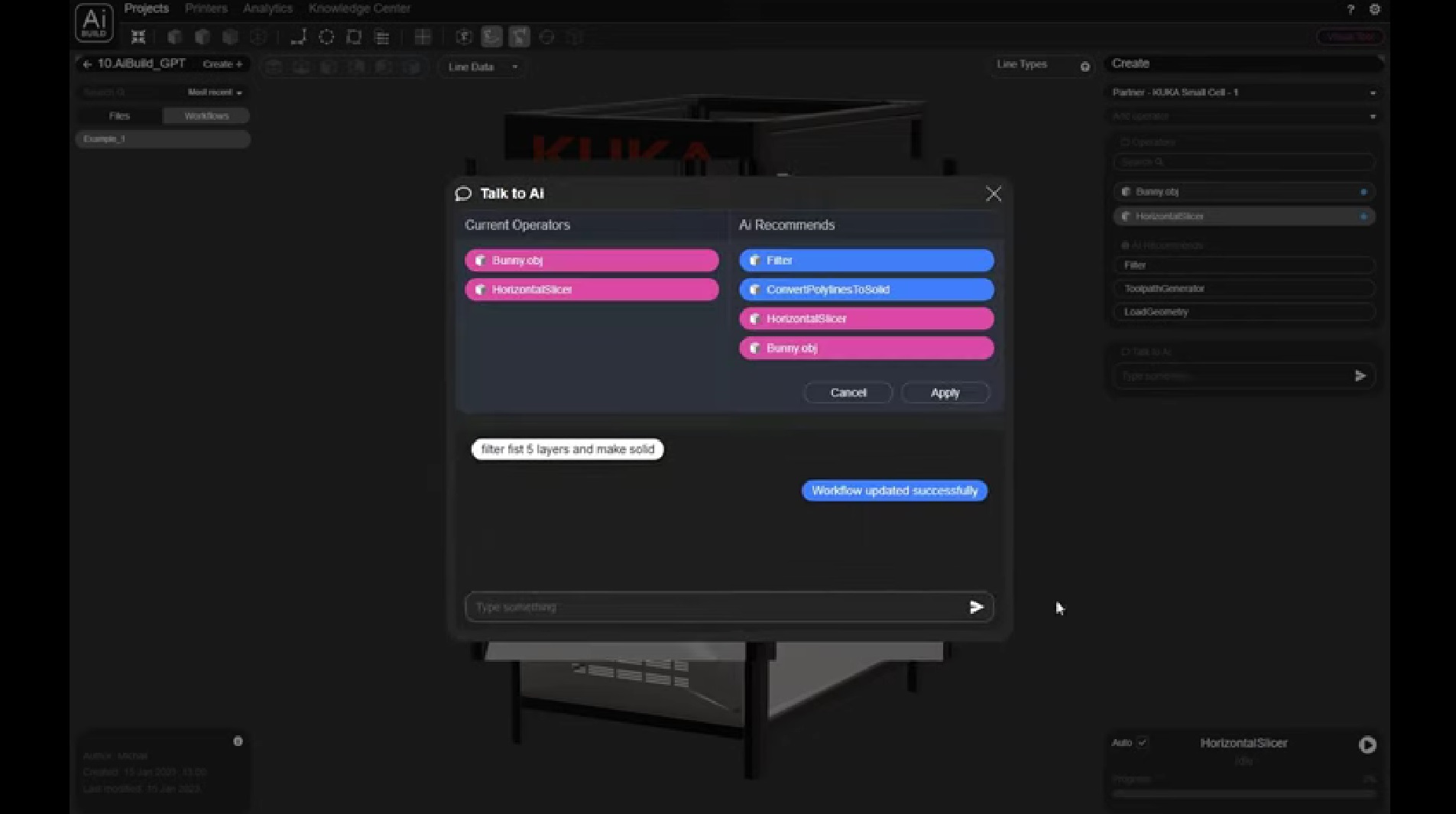 „Wir arbeiten mit den Branchenführern zusammen, um die Grenzen (falls vorhanden) dieser bahnbrechenden Entwicklung in der Workflow-Automatisierung der additiven Fertigung festzulegen. Die zugrunde liegende Technologie ist die Kombination aus der visuellen Toolpath-Programmier-Engine von Ai Build und dem großen Sprachmodell GPT von OpenAI, das mit jahrelangen realen Fertigungsdaten aus unserem AiLab in London gespeist wird.“