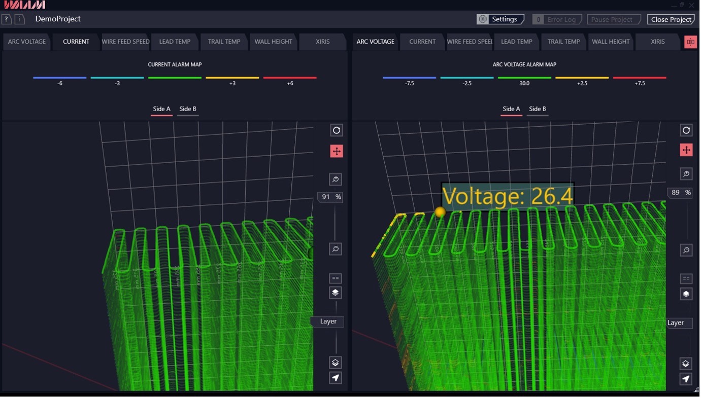 Die Software kümmert sich um die Prozessüberwachung von Spannung, Strom, Drahtvorschubgeschwindigkeit, Bewegungsgeschwindigkeit, Drahtposition, Schichthöhe, Temperatur vor und nach der Abscheidung, Sauerstoff, Gasfluss und Schmelzbad. Alle wichtigen Prozessparameterdaten lassen sich protokollieren und auf die Echtzeitdarstellung einer 3D-Karte der protokollierten Daten auf einem tatsächlichen Werkzeugweg zugreifen. Die 3D-Diagramme sind Echtzeit-farbcodiert, was dabei helfen soll, große Ablagerungsdaten zu verstehen, die über die reale Geometrie des Teils abgebildet werden. Die Software kann über ihre API in ERP- und MRP-Systeme integriert werden und ermöglicht dabei Push-to-Post-Prozesse.