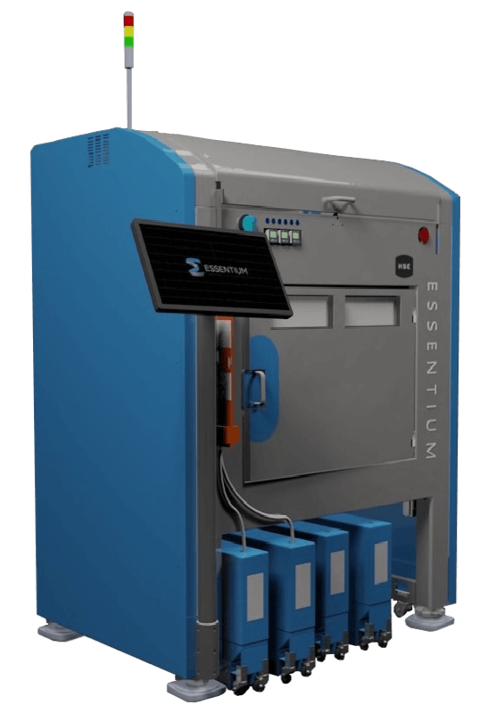 Die Firma Essentium verkauft 3D-Drucker und entwickelt Verbrauchsmaterialien für die Fertigung und das Softwareprogramm für die additive Fertigungstechnik. Die neue Excessive Velocity Extrusion (HSE) Plattform des Unternehmens ($75.000) nutzt Essentiums patentierte FlashFuse-Technologie, eine zweiteilige, elektrische Schweißlösung, die Nanomaterialtechnologie und Hardwaretechnologie kombiniert, um die Kraft des Plasmas zu nutzen, um das Z-Stärke-Problem zu lösen, das seit langem FDM-Druckteile plagt. Mit dieser Technologie ist es nun möglich, die einzelnen Schichten des Druckteils im Drucker während des Baus miteinander zu verschmelzen.